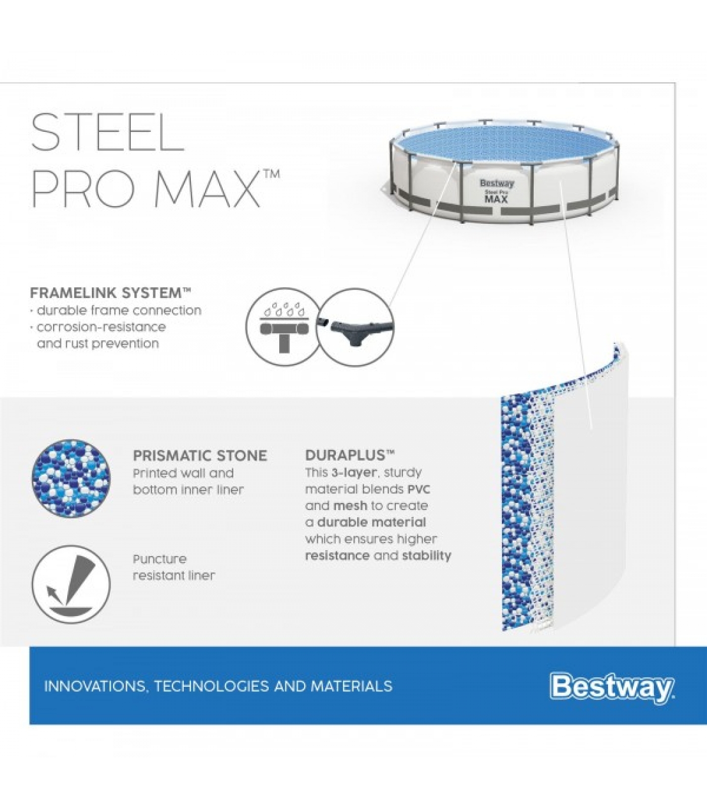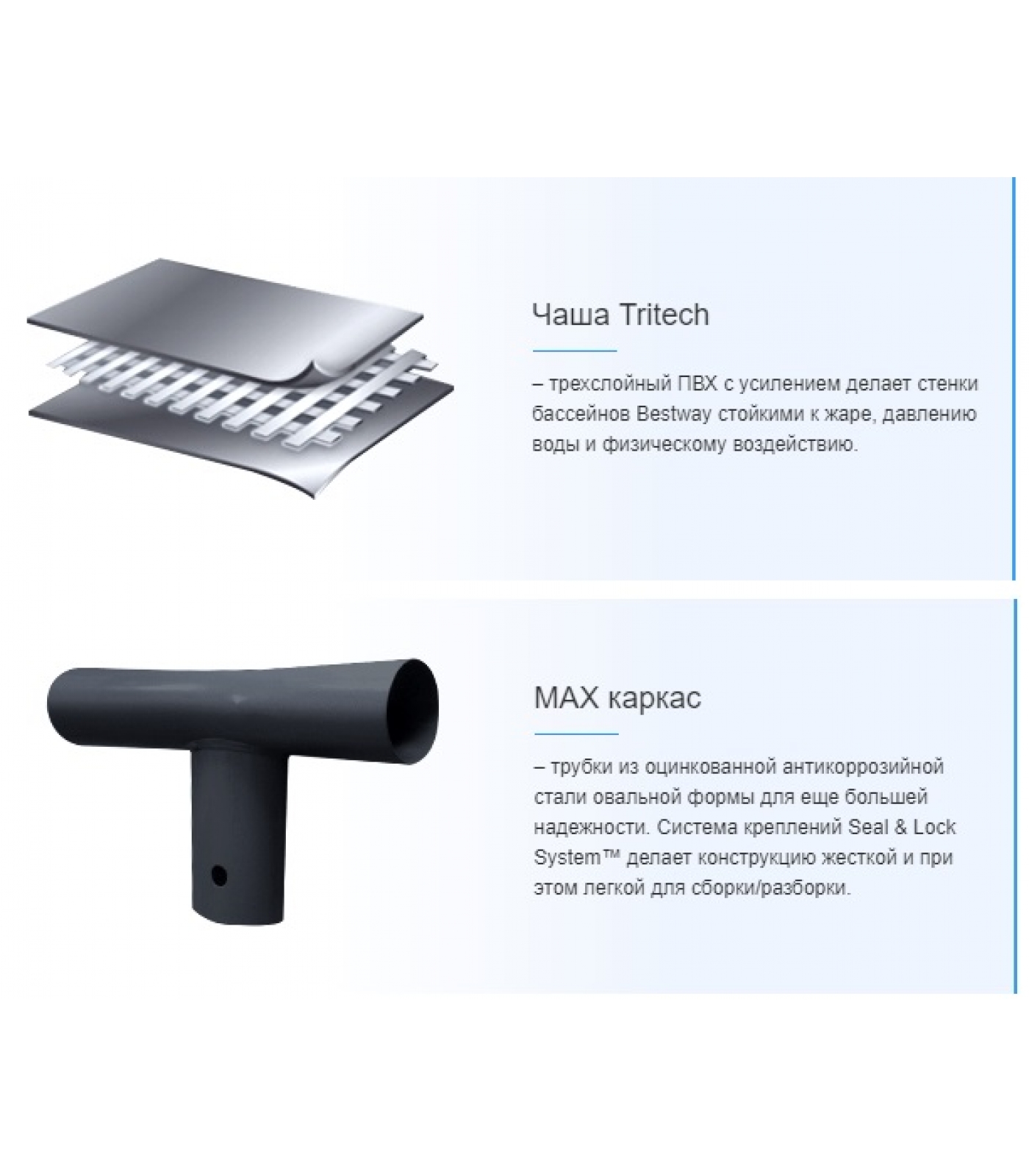 Материал чаши - это трехслойный армированный лайнер. Весь каркас имеет покрытие Framelink, которое защищает его от ржавчины, гарантирует высокую надежность и долговечность всей конструкции. Благодаря системе Seal&Lock System обеспечивается надежная фиксация всех элементов. Рисунок внутренней поверхности чаши выполнен в виде природной гальки. Комплектуется бассейн лестницей, сменным картриджем для фильтра, фильтрационной установкой и защитным тентом, которые гарантируют поддержку чистоты воды на протяжении всего сезона купания.