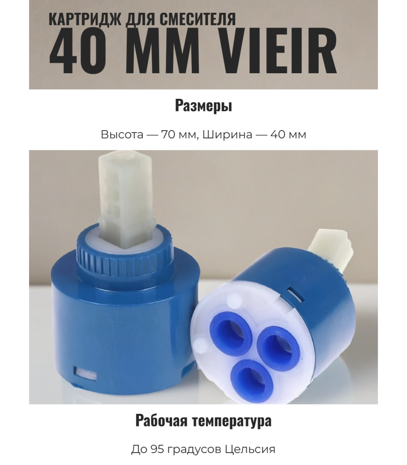 Картридж для смесителя 40 мм ViEiR VRLX40 предназначен для смешивания потока воды и регулировки напора. Запорным элементам картриджа служит пара керамических пластин, что значительно увеличивает срок ее эксплуатации. Данный картридж совершено бесшумный за счет керамических пластин и специальной сеточки.
