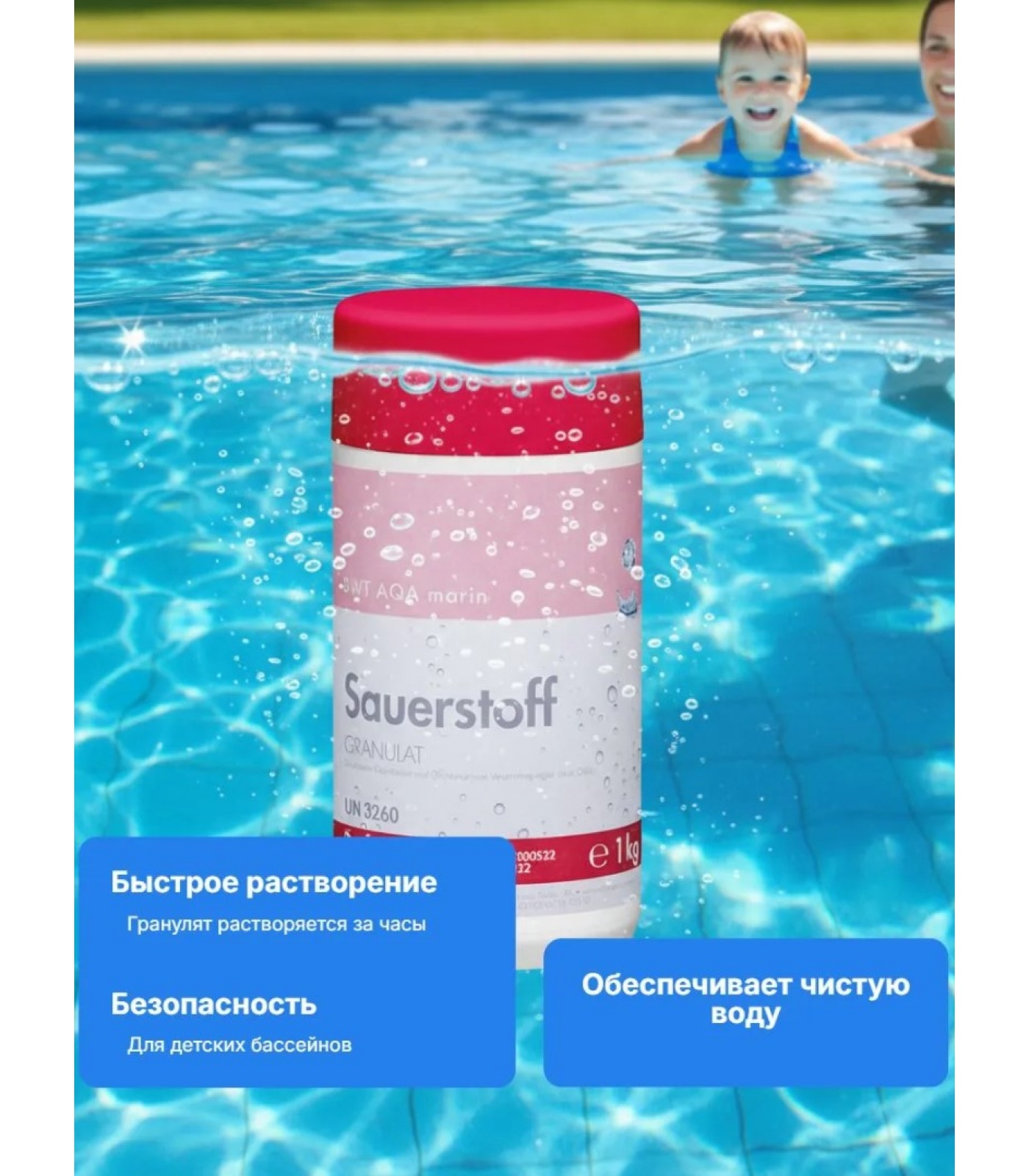 Сильнодействующий кислородный гранулят хорошо растворяется и подходит для мгновенной обработки воды в бассейне. Пользоваться бассейном можно уже через несколько часов после обработки. Подходит для людей, чувствительных к хлору.