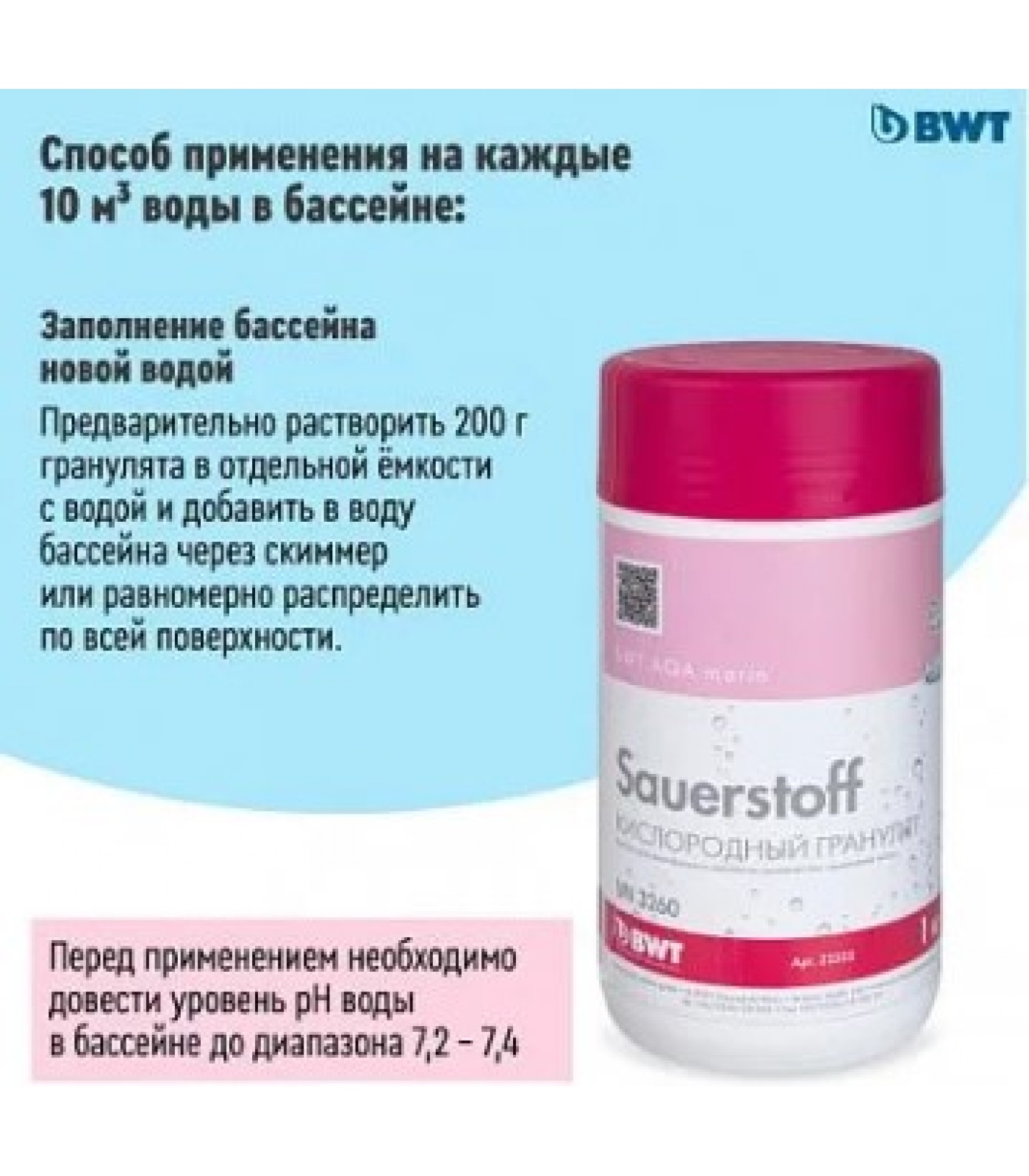 Кислородный гранулят растворяется в чистой пластмассовой емкости до его добавления в воду бассейна (сначала залить воду в емкость, затем добавить реагент и перемешать). Никогда не засыпать непосредственно сам гранулят в бассейн, так как он обладает отбеливающим действием.