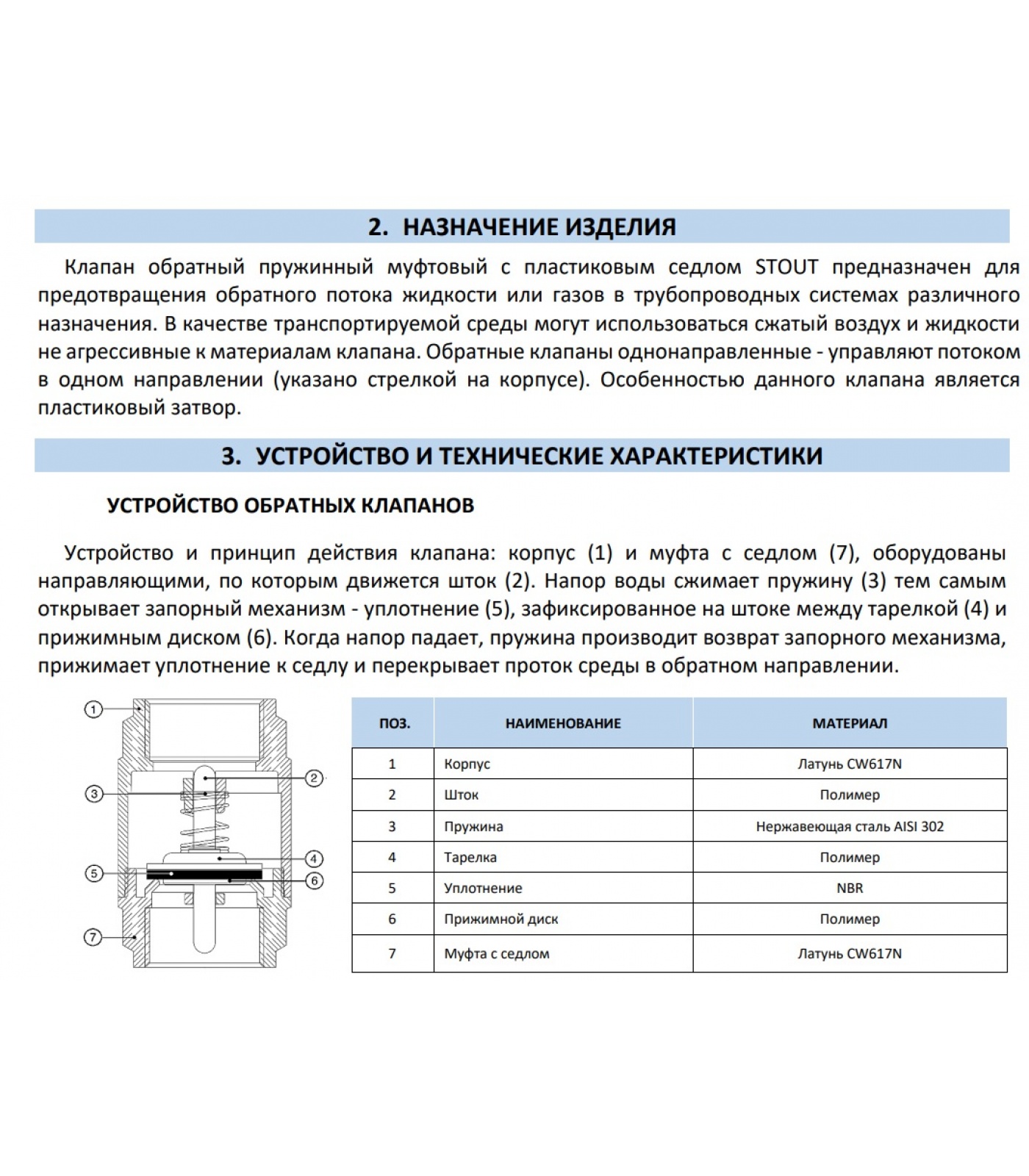 Клапан обратный пружинный муфтовый с пластиковым седлом STOUT предназначен для предотвращения обратного потока жидкости или газов в трубопроводных системах различного назначения. В качестве транспортируемой среды могут использоваться сжатый воздух и жидкости не агрессивные к материалам клапана. Обратные клапаны однонаправленные - управляют потоком в одном направлении (указано стрелкой на корпусе). Особенностью данного клапана является пластиковый затвор.