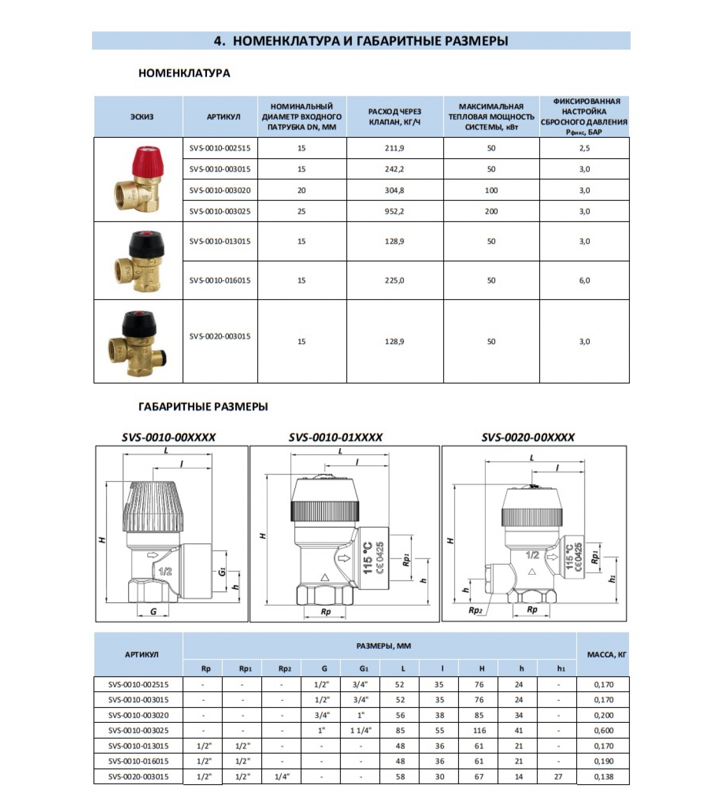 Клапан предохранительный нерегулируемый, c фиксированной заводской настройкой 3 бара. Обеспечивает защиту от превышения давления водогрейных котлов, бойлеров, сосудов под давлением, систем отопления, напорных трубопроводов сбросом рабочей среды (в качестве рабочей среды может использоваться вода, растворы этиленгликоля или пропиленгликоля и другие жидкости, нейтральные по отношению к материалам клапана) в окружающую среду либо дренажный трубопровод. Предусмотрена возможность ручного открытия клапана предохранительного для проверки работоспособности, профилактики залипания золотниковой обоймы. Резьба присоединения – внутренняя, 1/2".