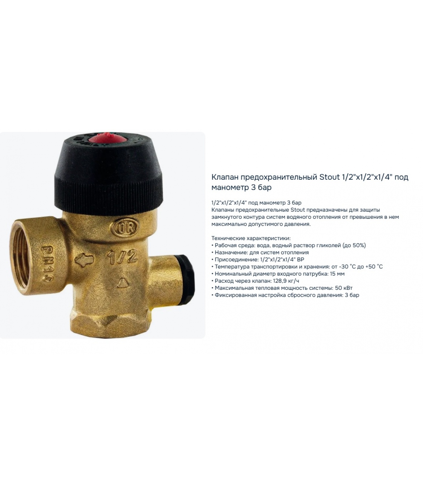Клапан предохранительный Stout 1/2"x1/2"x1/4" под манометр 3 бар предназначен для защиты замкнутого контура систем водяного отопления от превышения в нем максимально допустимого давления.