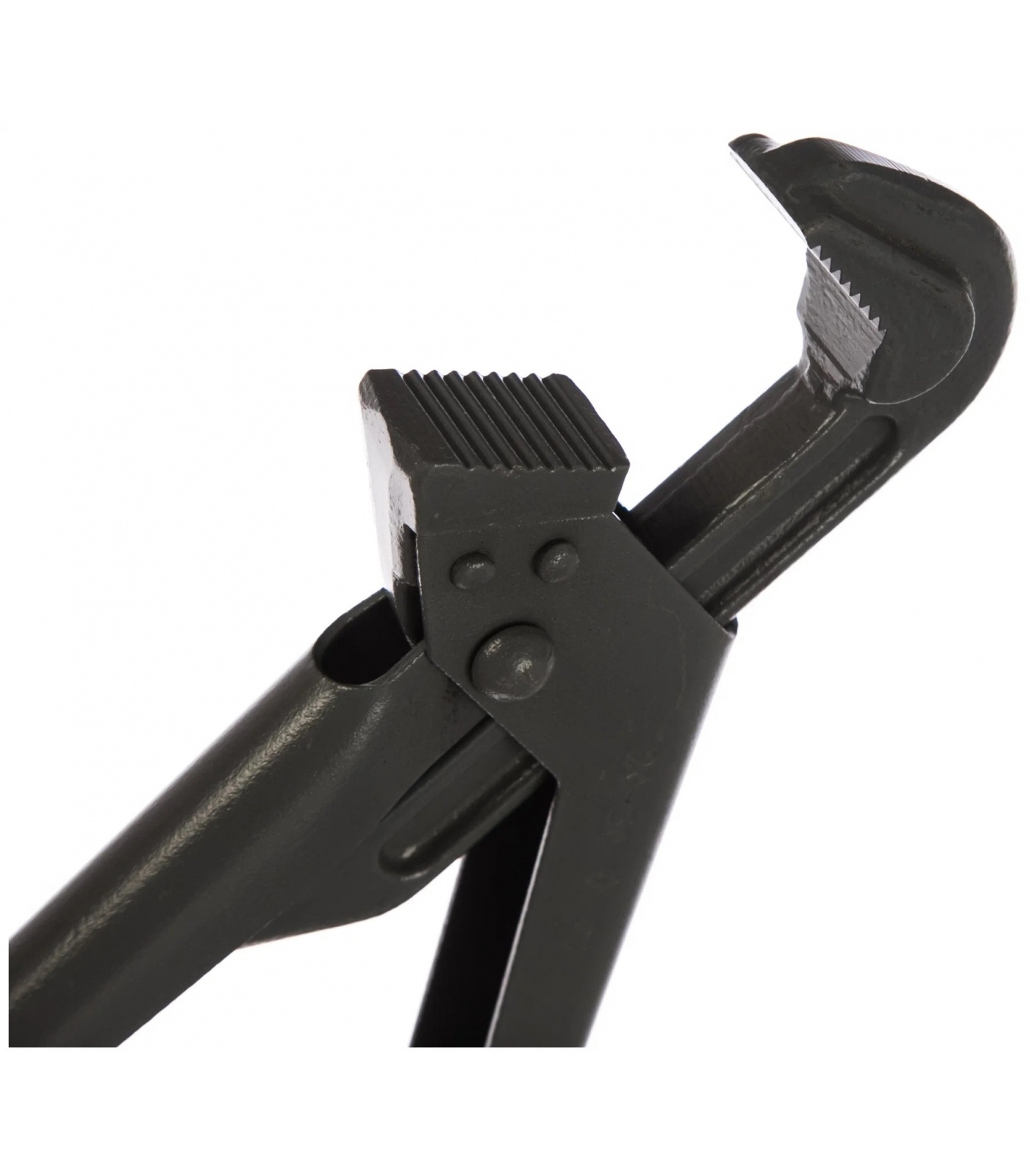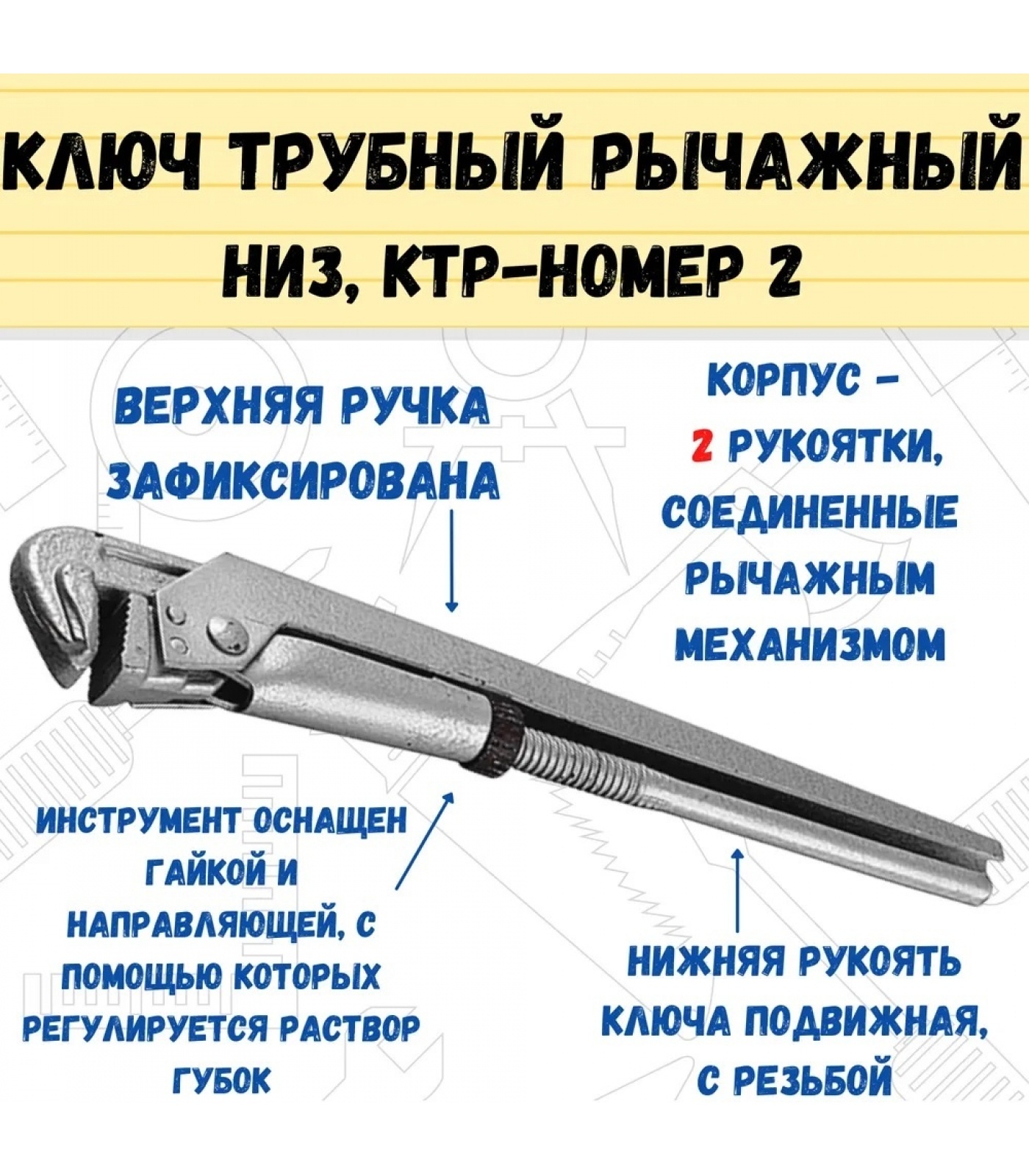 Ключ трубный рычажный №2 (газовый) используется при монтаже трубопровода в системах газового и водяного снабжения. Корпус представлен 2 рукоятками, соединенными рычажным механизмом. Нижняя рукоять ключа подвижная, с резьбой. Также инструмент оснащен гайкой и направляющей, с помощью которых регулируется раствор губок. Прямые губки захватывают деталь в двух точках, а их ребристая поверхность способствует исключению проскальзывания. Наклон зубьев против направления вращения. Максимальный диаметр трубы - 50 мм. Верхняя ручка зафиксирована.