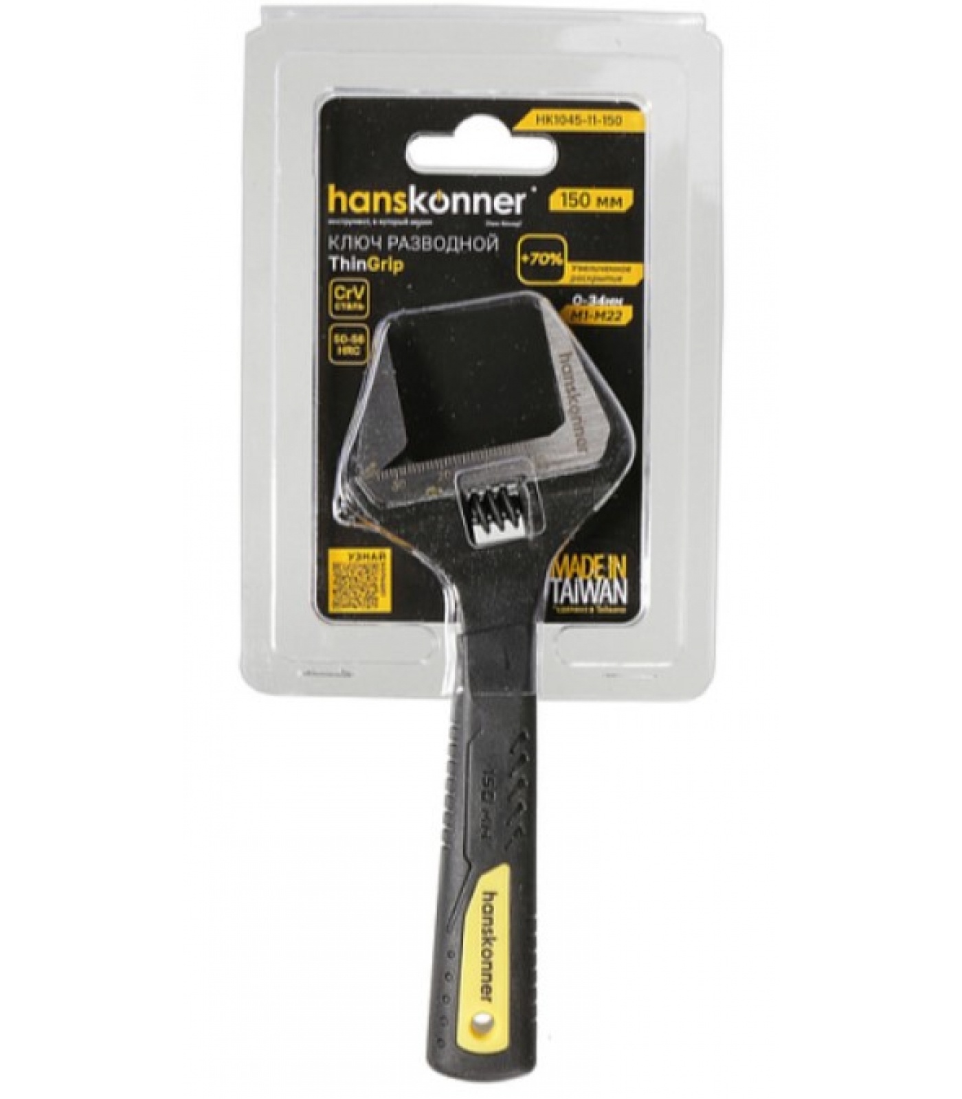 Ключ разводной 150 мм, усиленные тонкие губки, обрезиненная рукоятка, Hanskonner