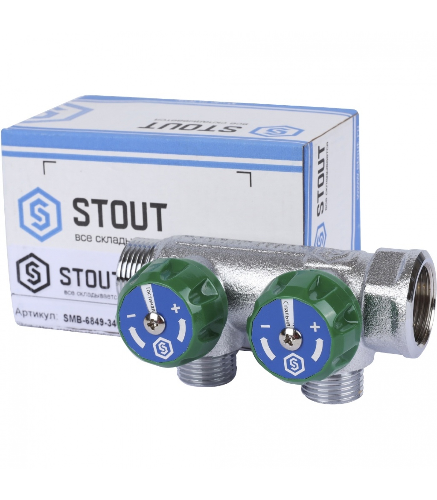 Коллектор распределительный Stout SMB-6849 3/4"х1/2" с 2 отводами, регулировочно-отсечные клапаны
