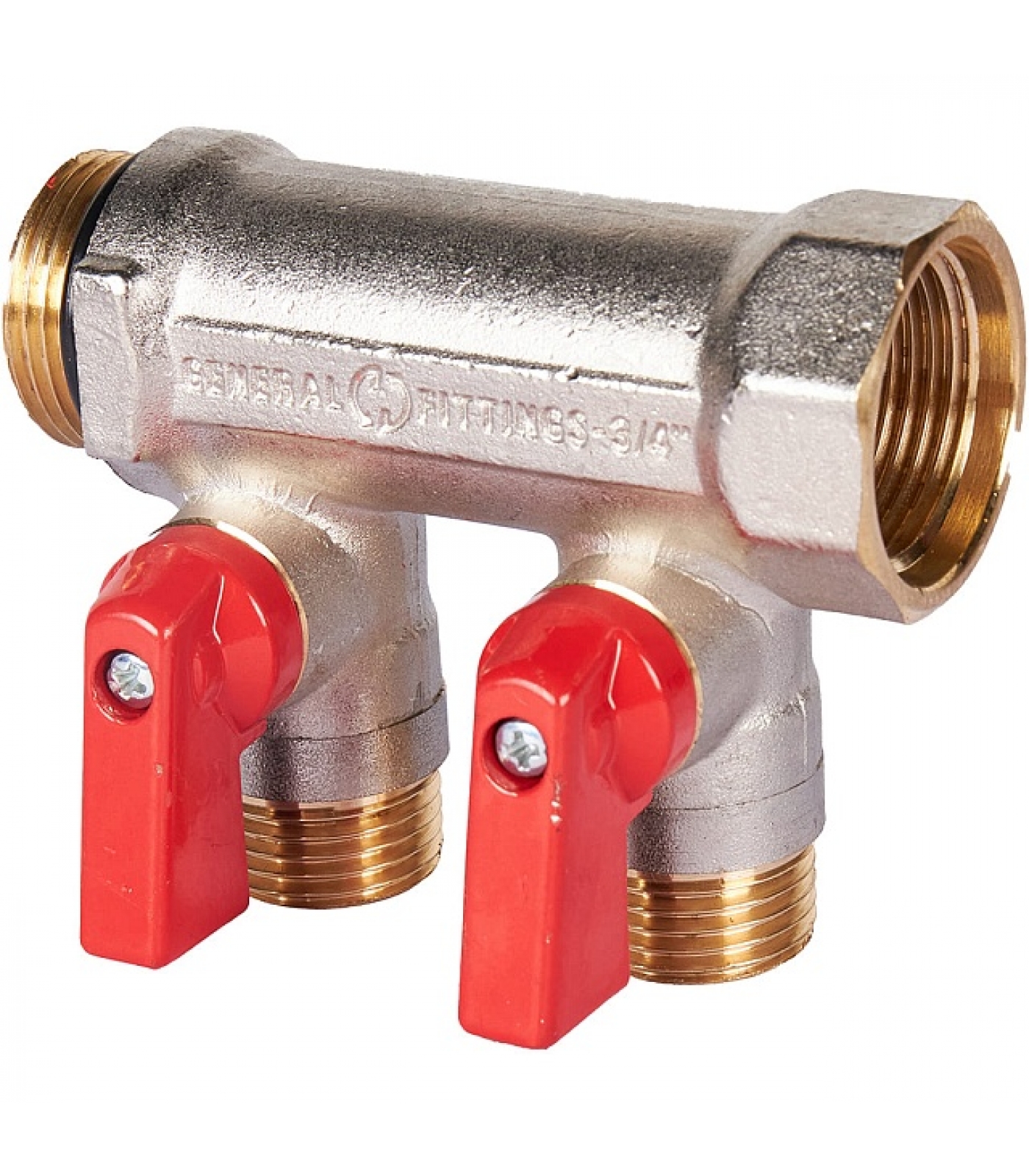Коллектор с шаровыми кранами STOUT 3/4 , 2 отвода 1/2 (красные ручки)