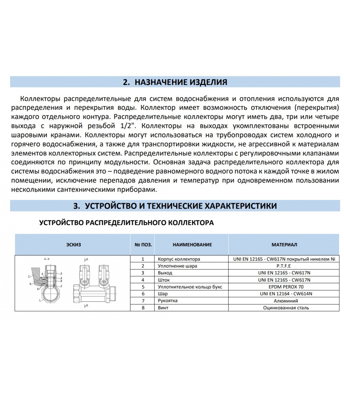 Коллекторы распределительные для систем водоснабжения и отопления используются для распределения и перекрытия воды. Коллектор имеет возможность отключения (перекрытия) каждого отдельного контура. Распределительные коллекторы могут иметь два, три или четыре выхода с наружной резьбой 1/2". Коллекторы на выходах укомплектованы встроенными шаровыми кранами. Коллекторы могут использоваться на трубопроводах систем холодного и горячего водоснабжения, а также для транспортировки жидкости, не агрессивной к материалам элементов коллекторных систем. Распределительные коллекторы с регулировочными клапанами соединяются по принципу модульности. Основная задача распределительного коллектора для системы водоснабжения это – подведение равномерного водного потока к каждой точке в жилом помещении, исключение перепадов давления и температур при одновременном пользовании несколькими сантехническими приборами.