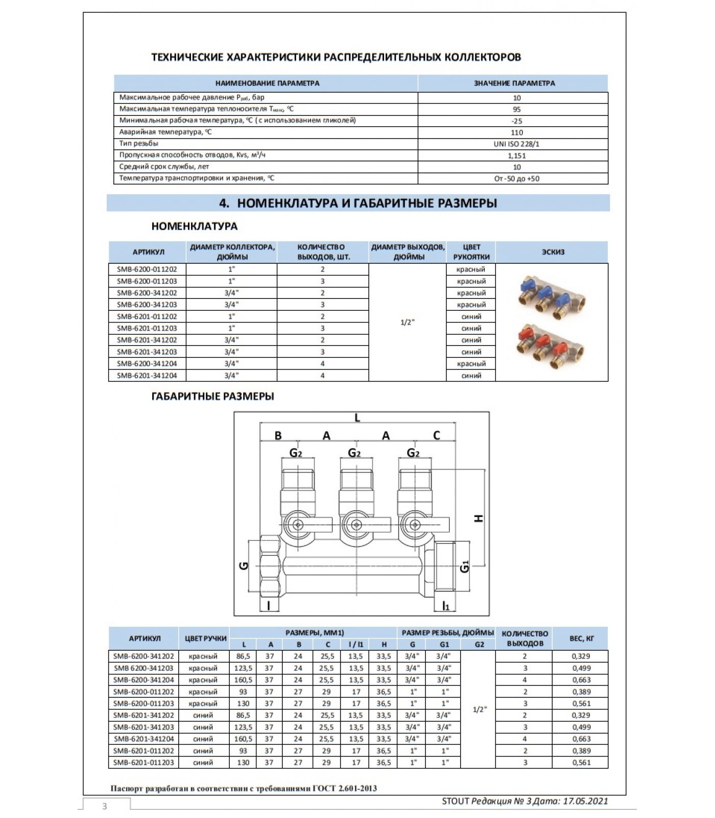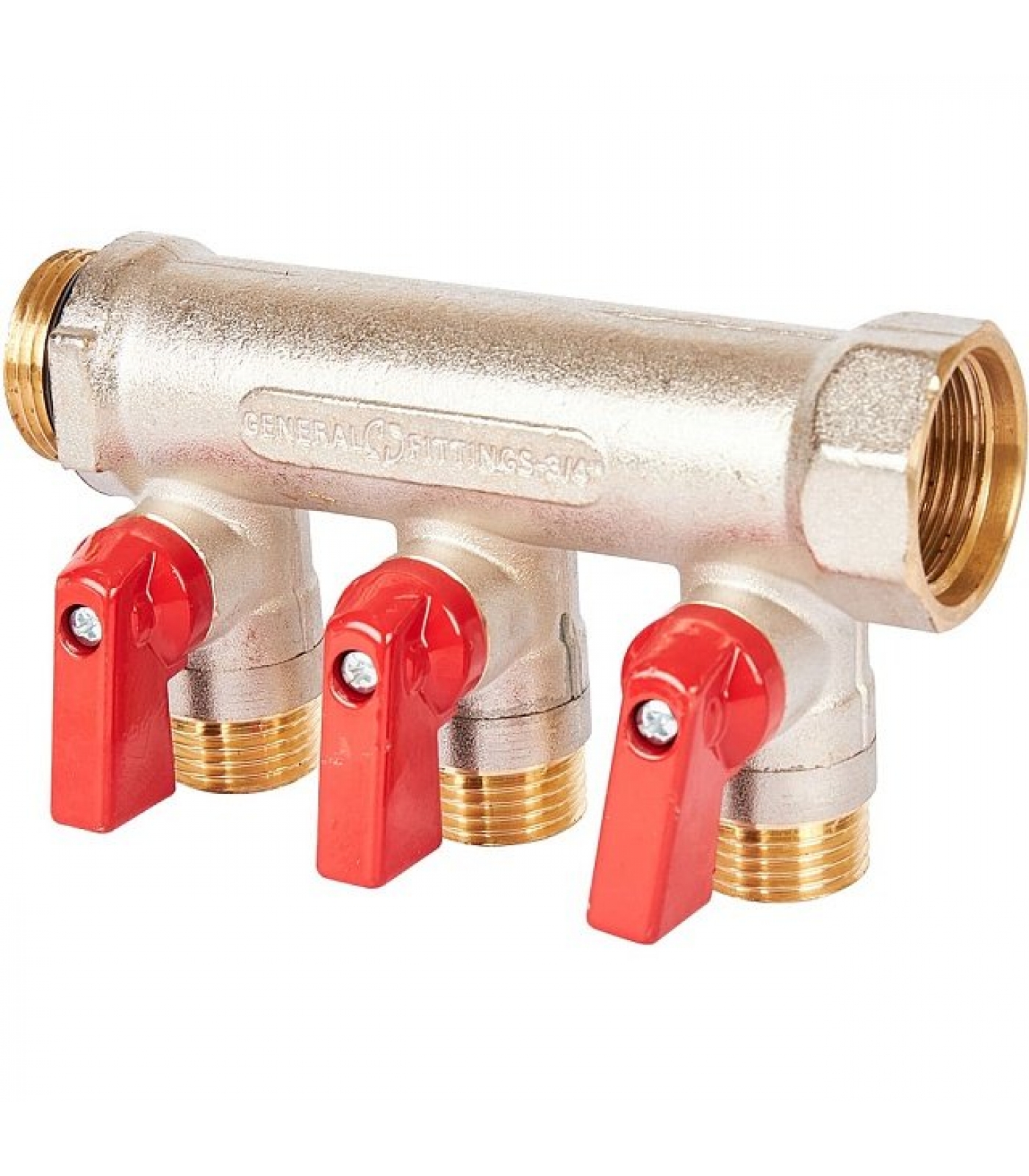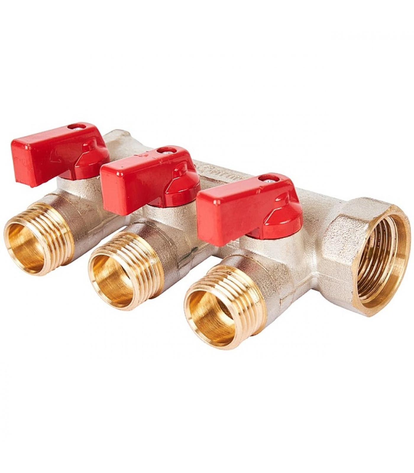 Коллектор с шаровыми кранами STOUT 3/4 , 3 отвода 1/2 (красные ручки)