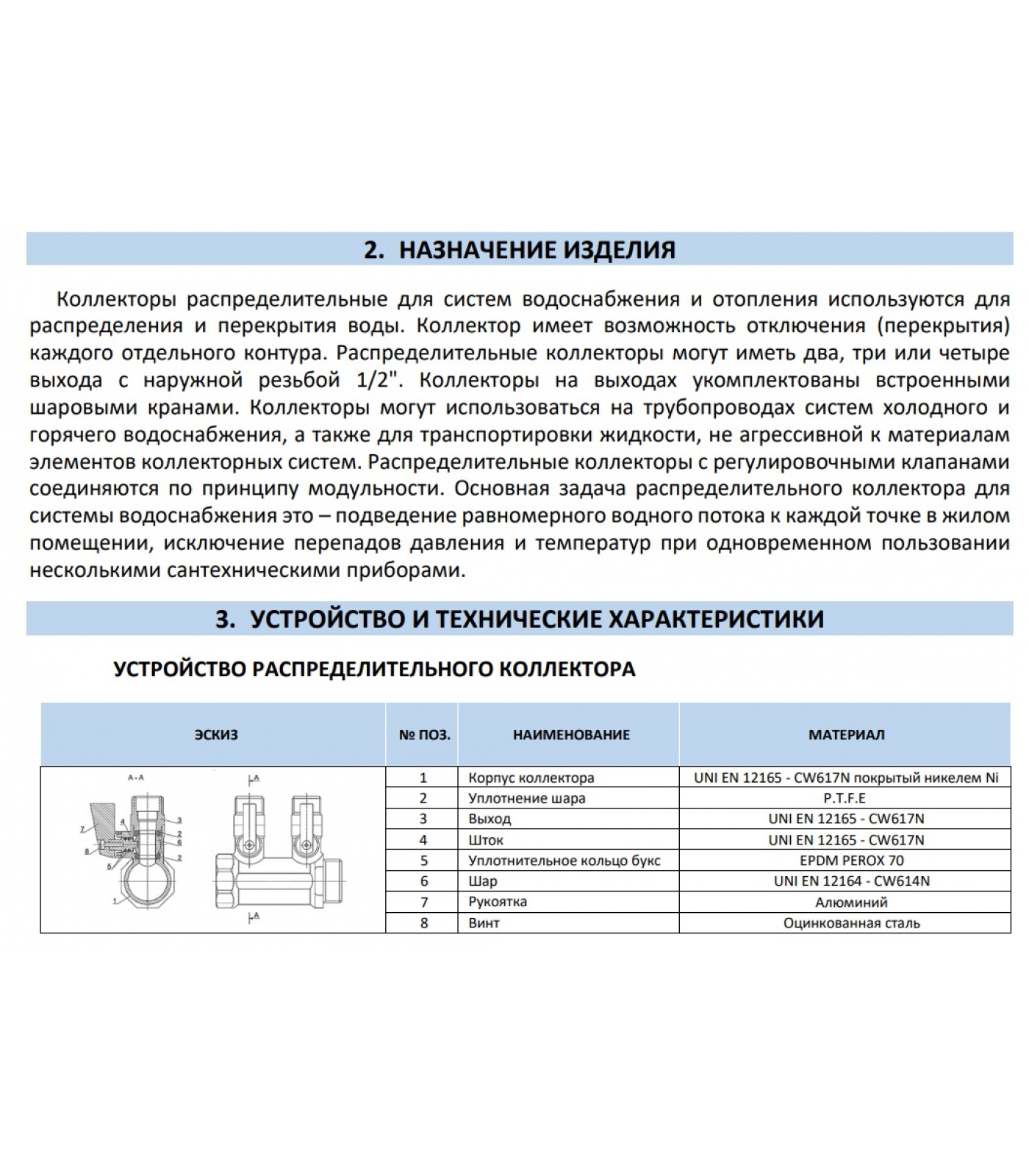 Коллекторы распределительные для систем водоснабжения и отопления используются для распределения и перекрытия воды. Коллектор имеет возможность отключения (перекрытия) каждого отдельного контура. Распределительные коллекторы могут иметь два, три или четыре выхода с наружной резьбой 1/2". Коллекторы на выходах укомплектованы встроенными шаровыми кранами. Коллекторы могут использоваться на трубопроводах систем холодного и горячего водоснабжения, а также для транспортировки жидкости, не агрессивной к материалам элементов коллекторных систем. Распределительные коллекторы с регулировочными клапанами соединяются по принципу модульности. Основная задача распределительного коллектора для системы водоснабжения это – подведение равномерного водного потока к каждой точке в жилом помещении, исключение перепадов давления и температур при одновременном пользовании несколькими сантехническими приборами.