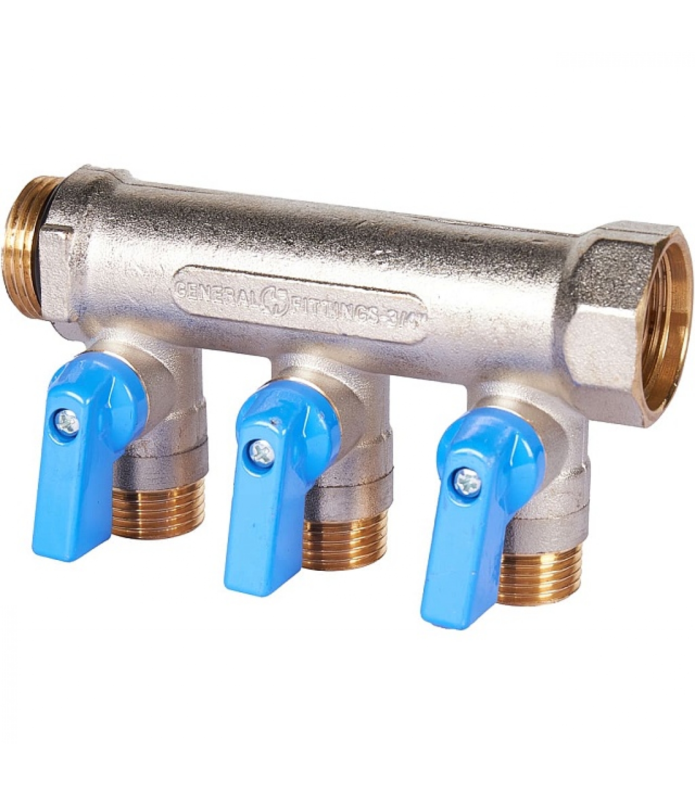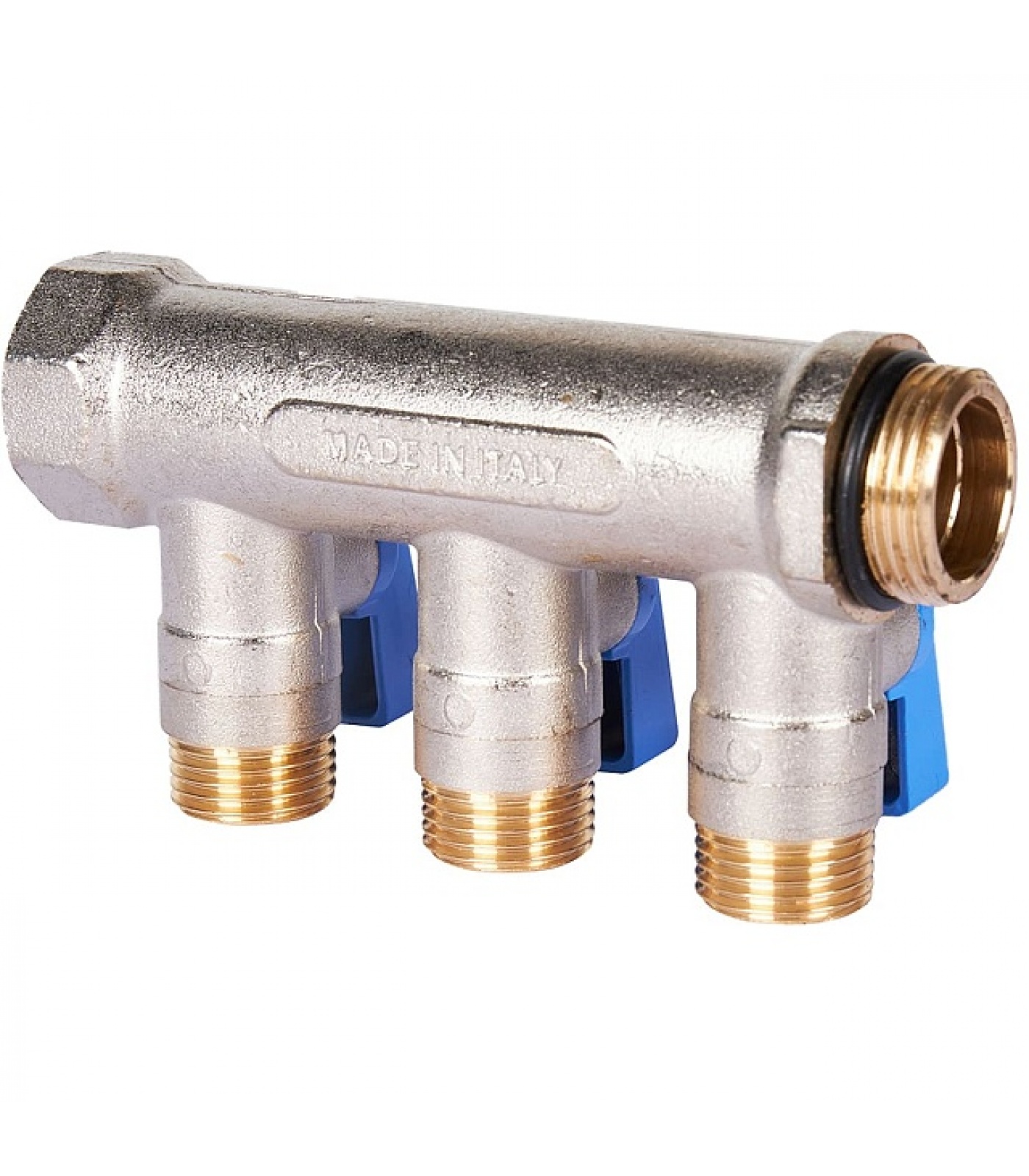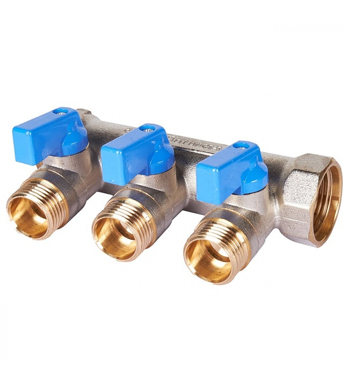 Коллектор с шаровыми кранами STOUT 3/4 , 3 отвода 1/2 (синие ручки)