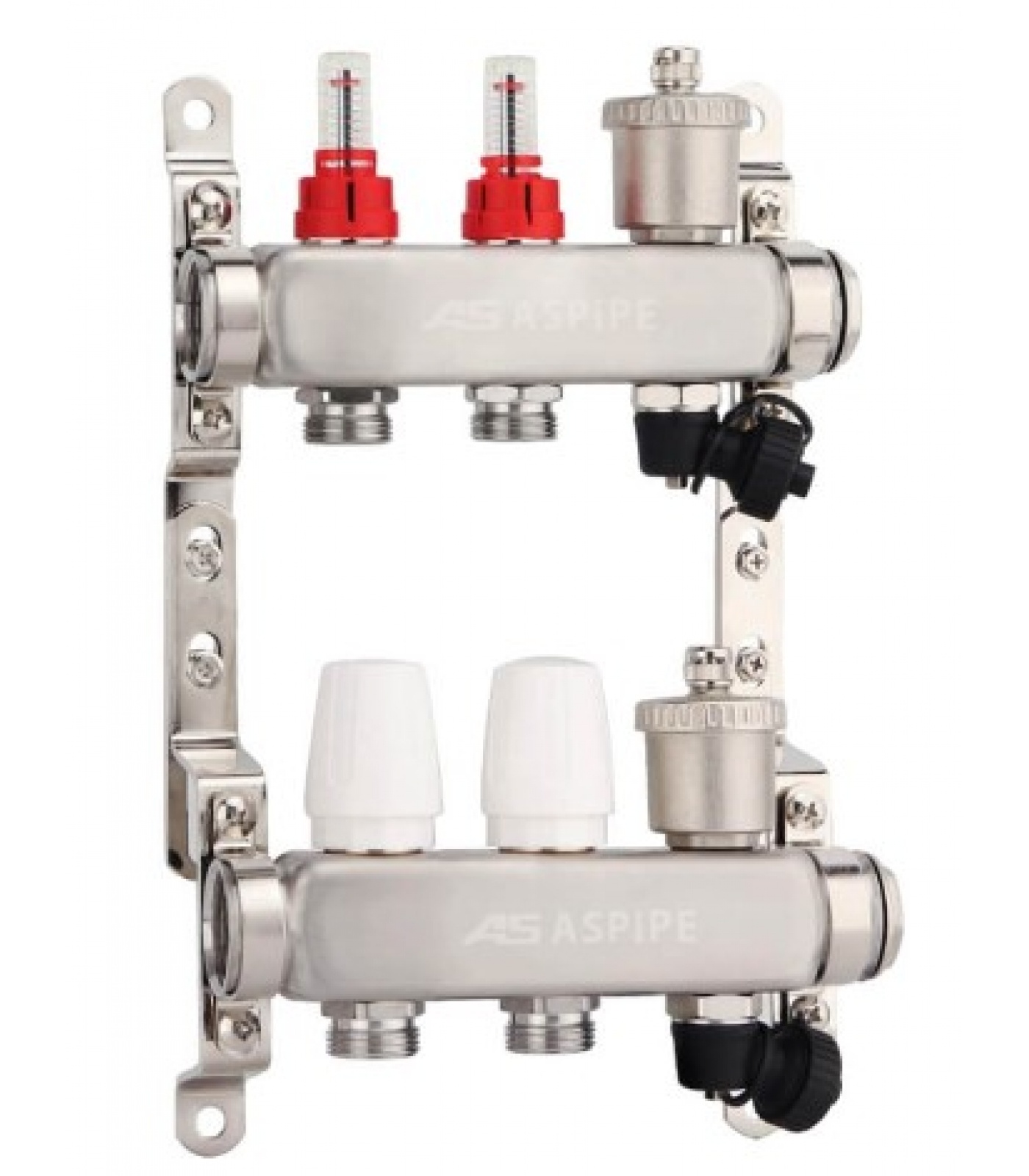 Коллекторная группа на 2 выхода 1"х3/4" Aspipe с расходомерами и воздухоотводчиком, сталь нержавею