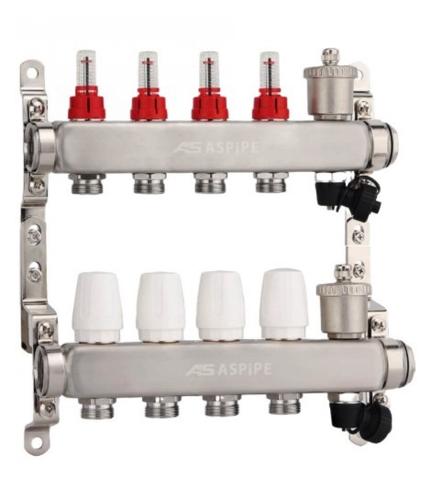 Коллекторная группа на 4 выхода 1"х3/4" Aspipe с расходомерами и воздухоотводчиком, сталь нержавею