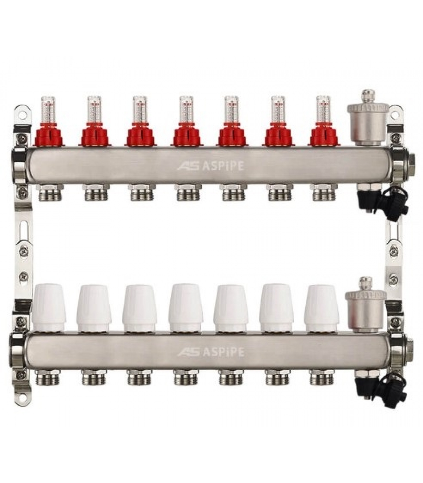 Коллекторная группа на 7 выхода 1"х3/4" Aspipe с расходомерами и воздухоотводчиком, сталь нержавею