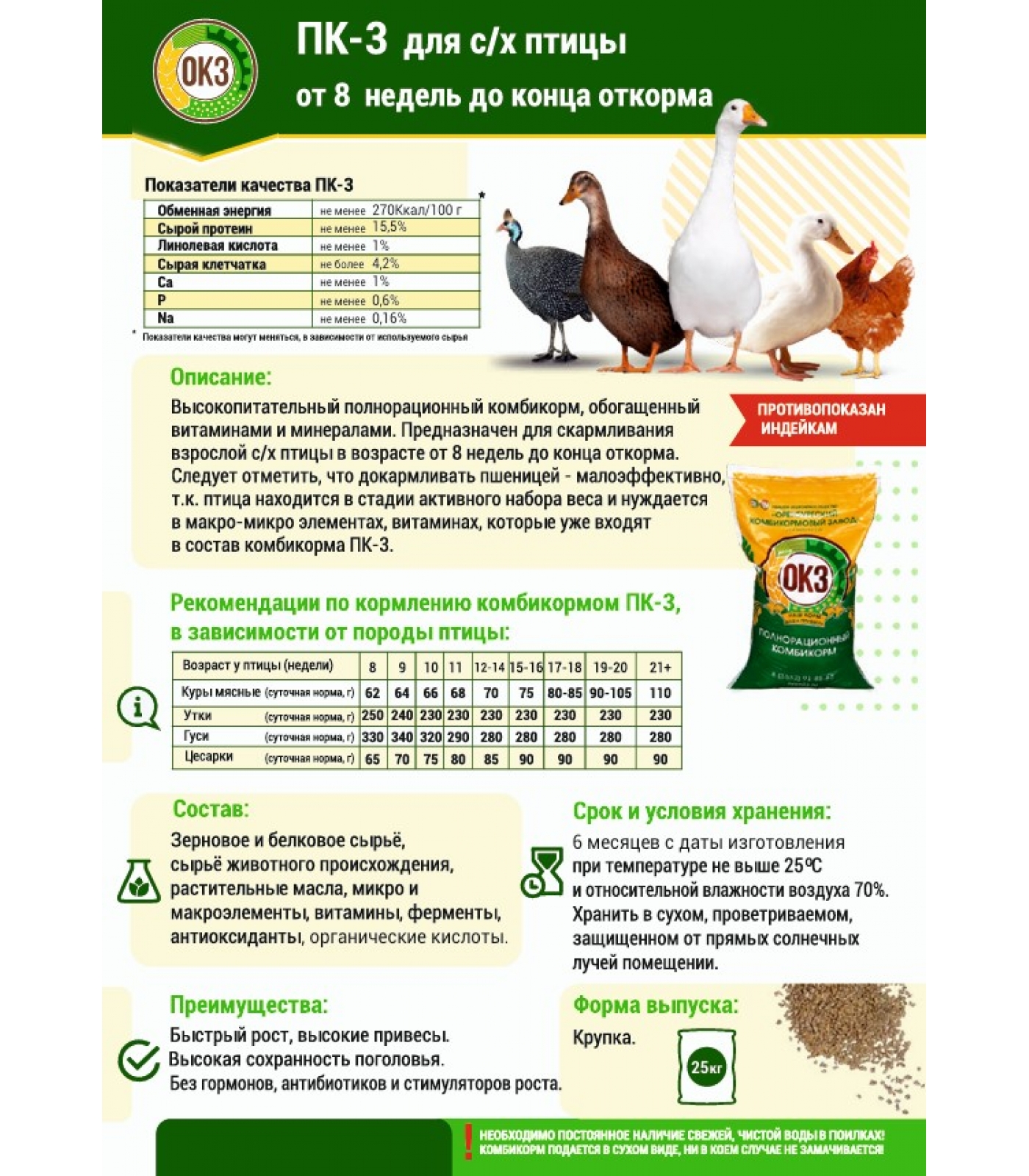Рекомендации по кормлению: Каждой птице необходимо 110 — 150 грамм комбикорма в день по мере роста.