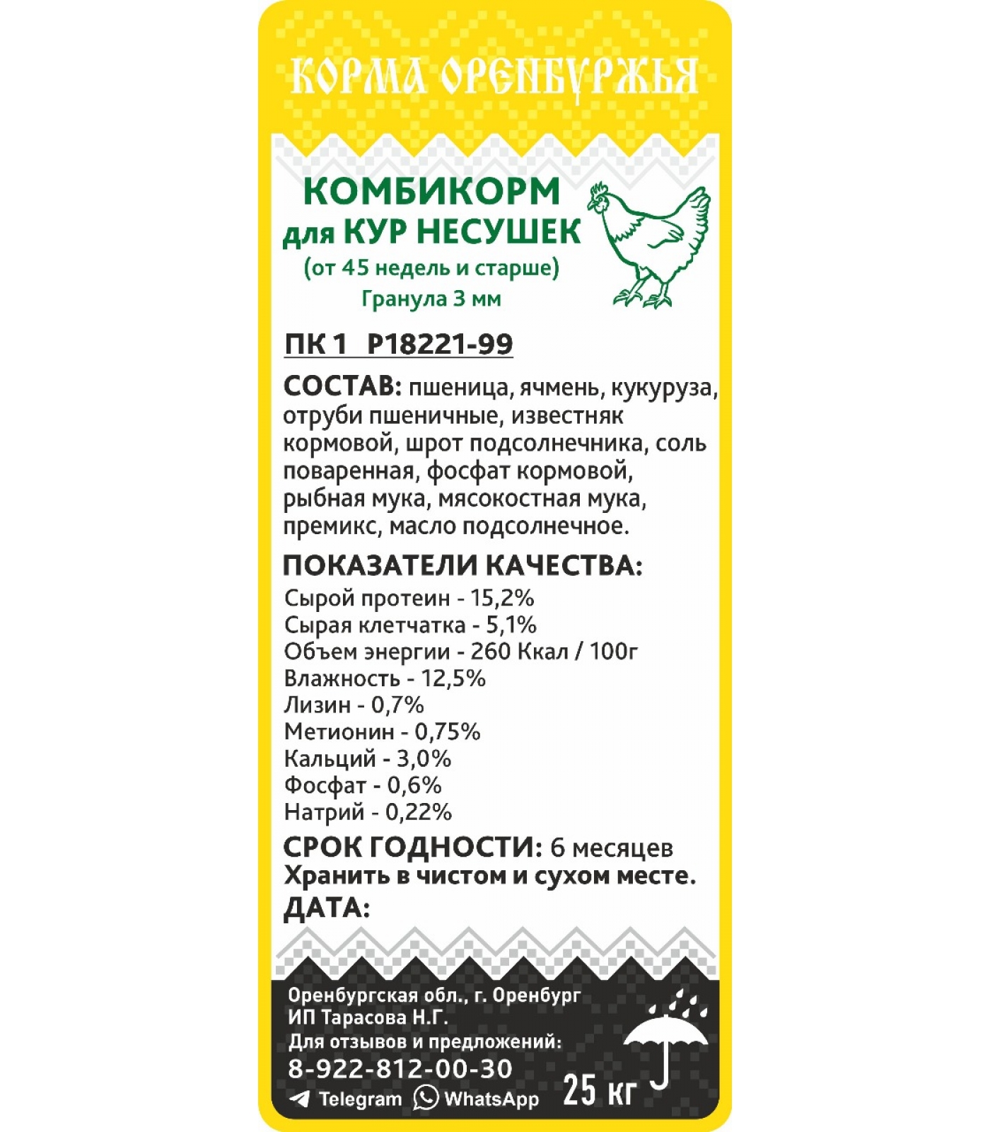 Состав: пшеница, ячмень, кукуруза, отруби пшеничные, известняк кормовой, шрот подсолнечника, соль поваренная, фосфат кормовой, рыбная мука, мясокостная мука, премикс, масло подсолнечное.