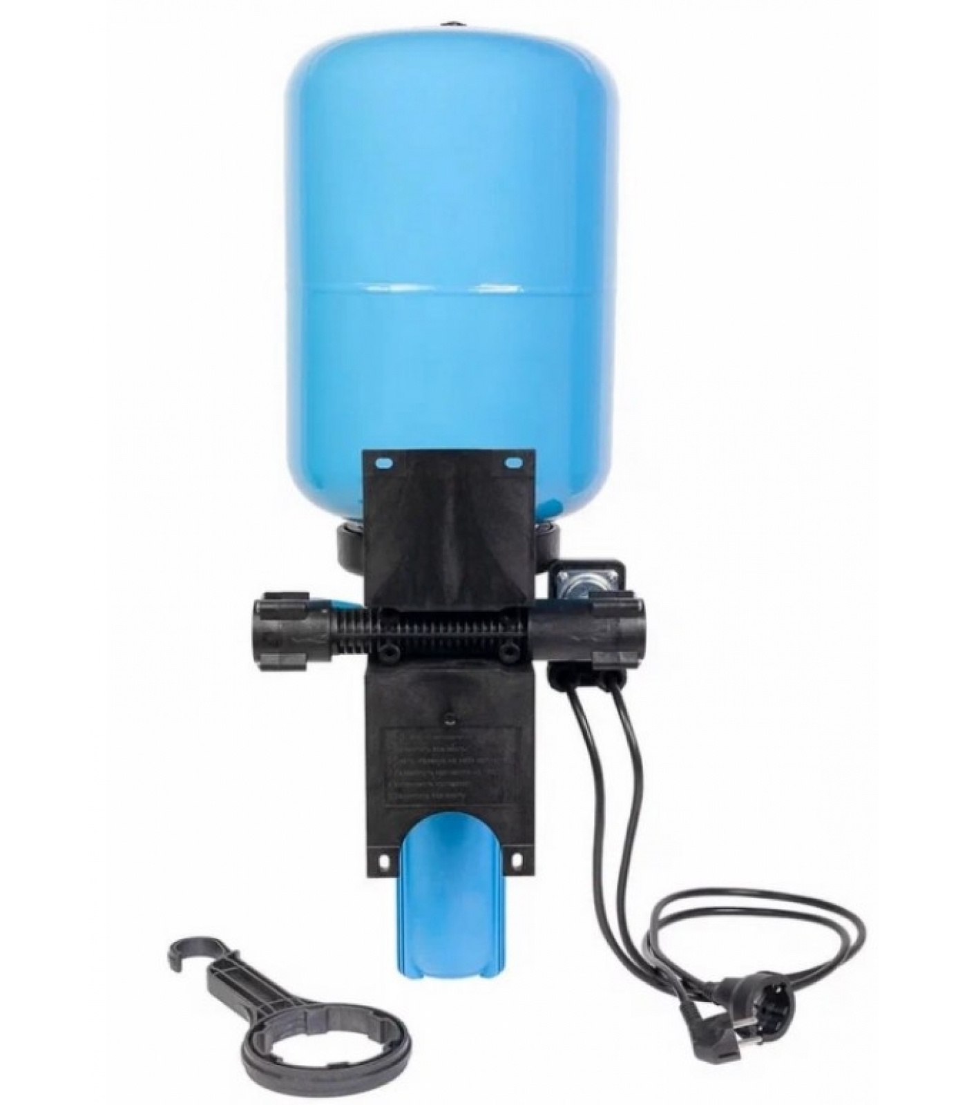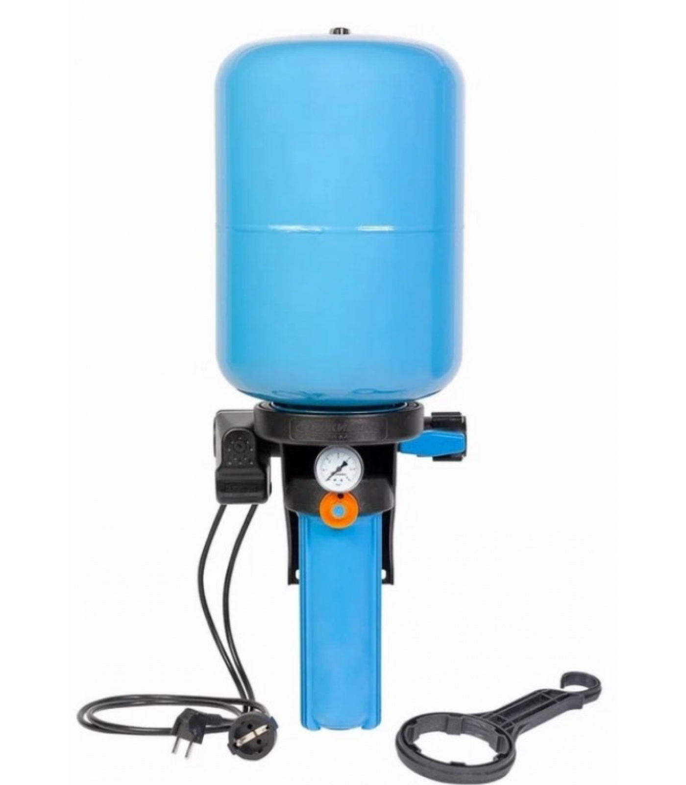 - съемный коллектор, который содержит встроенный шаровой кран с резьбовым патрубком на выходе, обратный клапан с резьбовым патрубком на входе, присоединительный штуцер для реле давления; коллектор содержит 3 цилиндрических патрубка и вставляется в ответные отверстия корпуса с возможностью обеспечить подачу воды слева направо или справа налево, уплотняется эластичным уплотнителем, фиксируется на корпусе винтами;