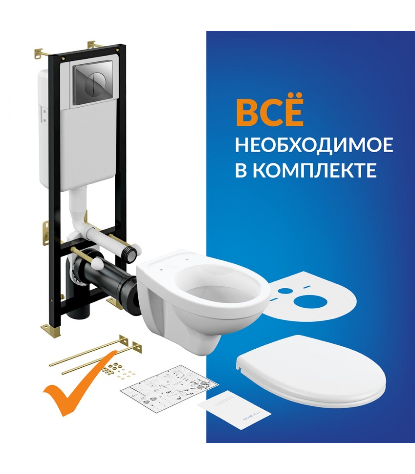 Комплектация: подвесной унитаз, крышка-сиденье, инсталляция, кнопка смыва, шумоизоляционная прокладка, монтажный комплект, гарантийный талон/инструкция.
