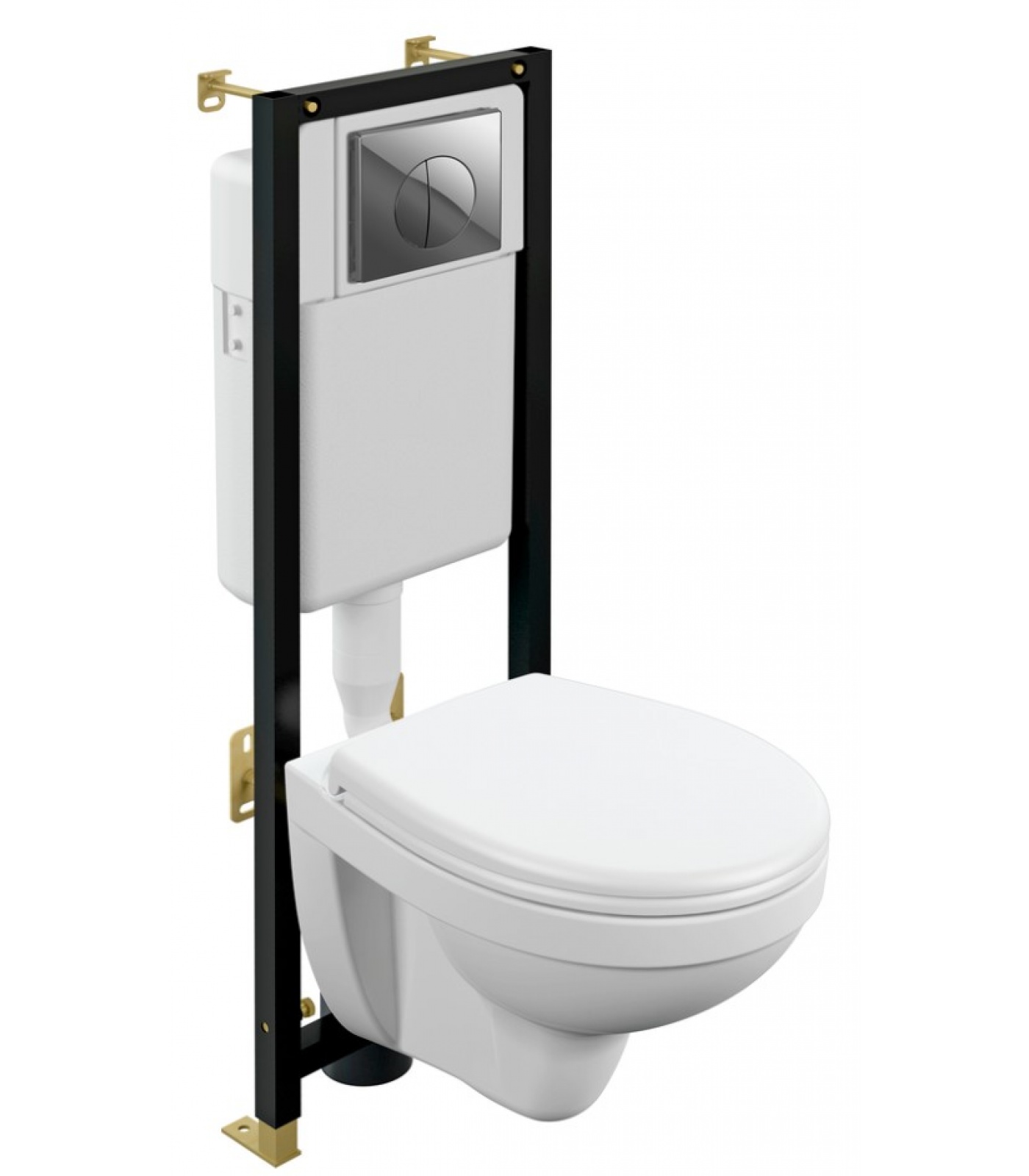 Комплект DELFI ободковый унитаз с сиденьем из термопластом, с инсталляцией BLACK и пластиковой кнопкой смыва LEON пластик хром глянцевый