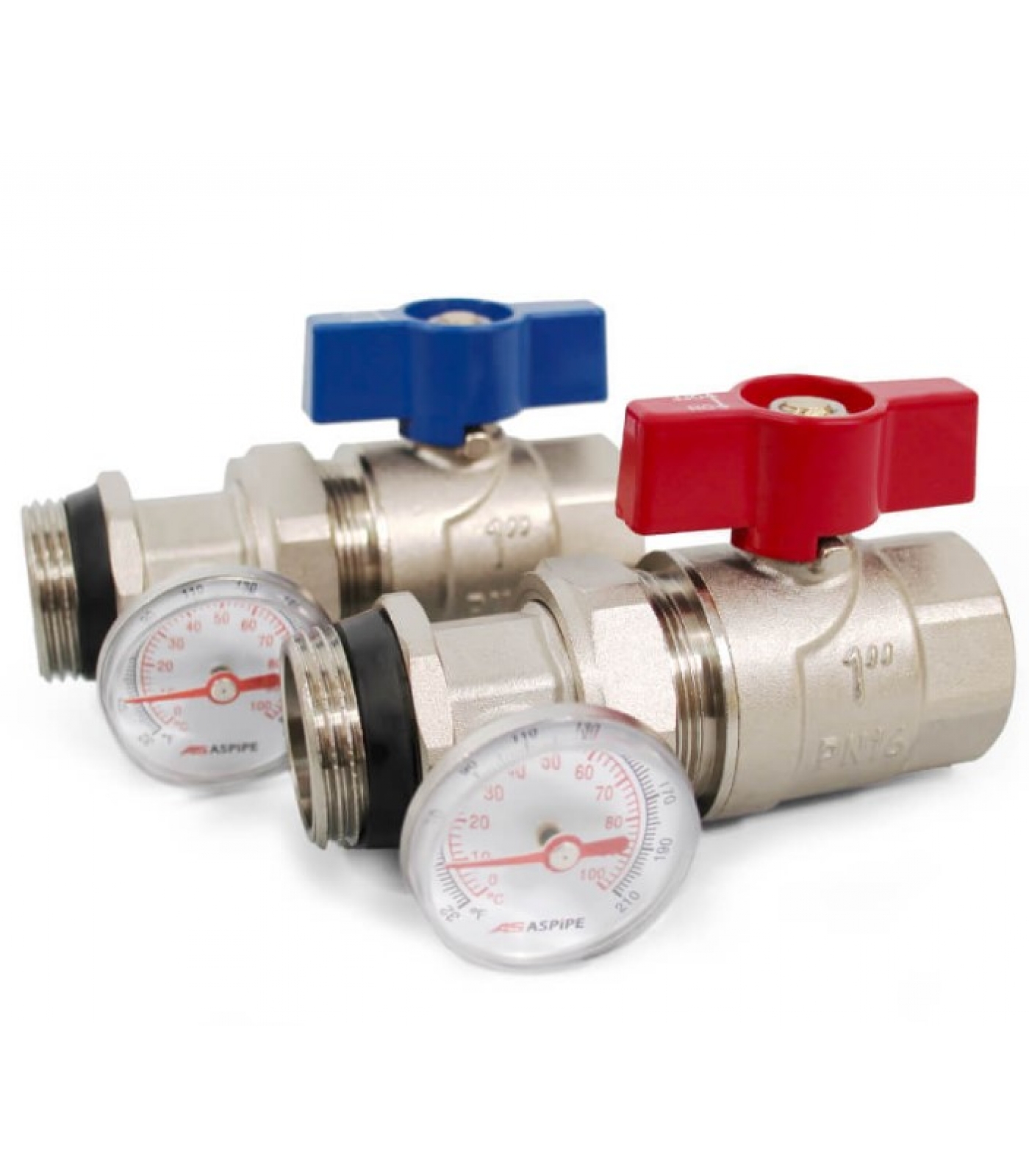 Комплект для коллектора 1" Aspipe краны шаровые с полусгоном и термометром