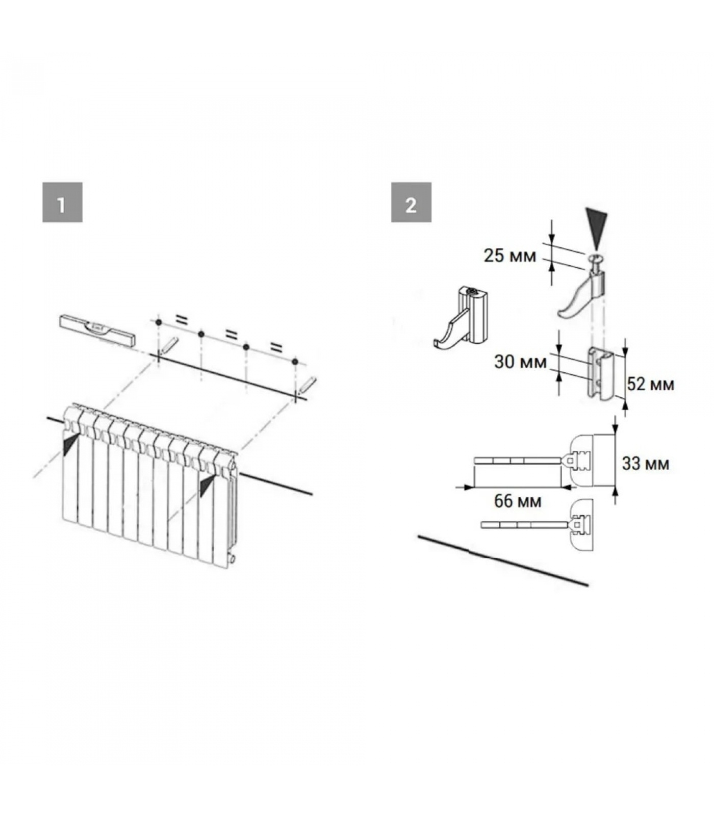 Требуемое число верхних и нижних кронштейнов зависит от количества секций радиатора.