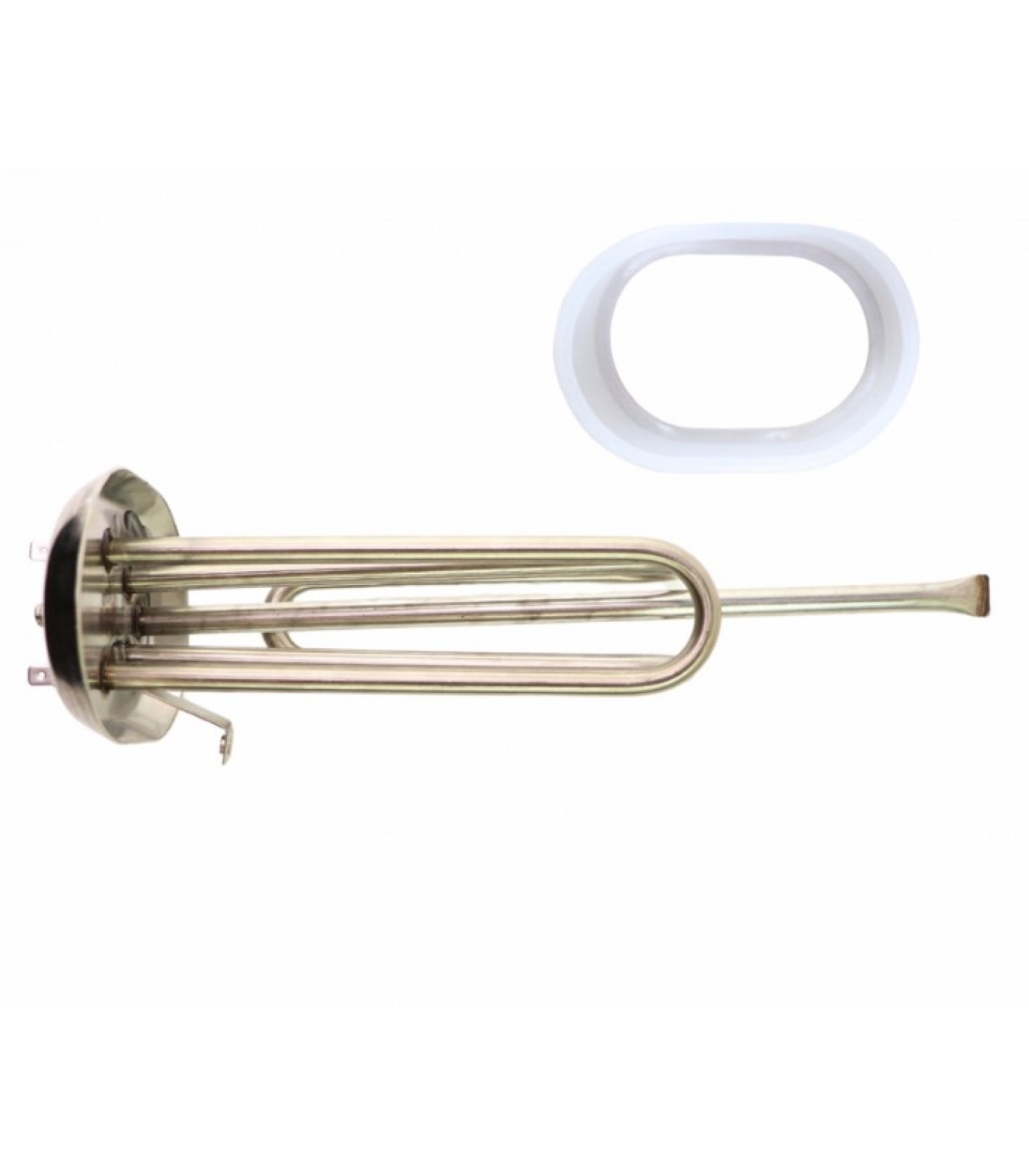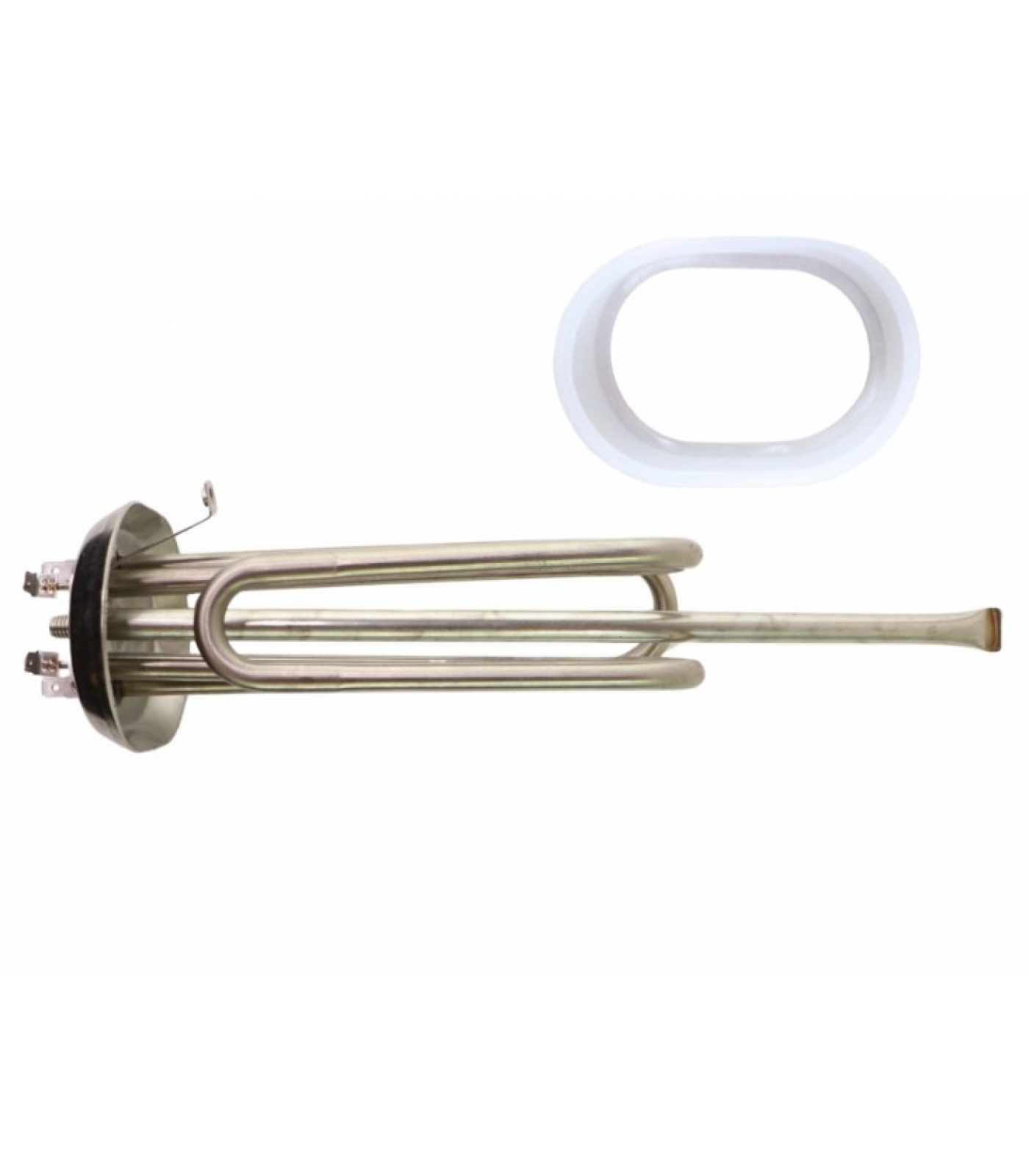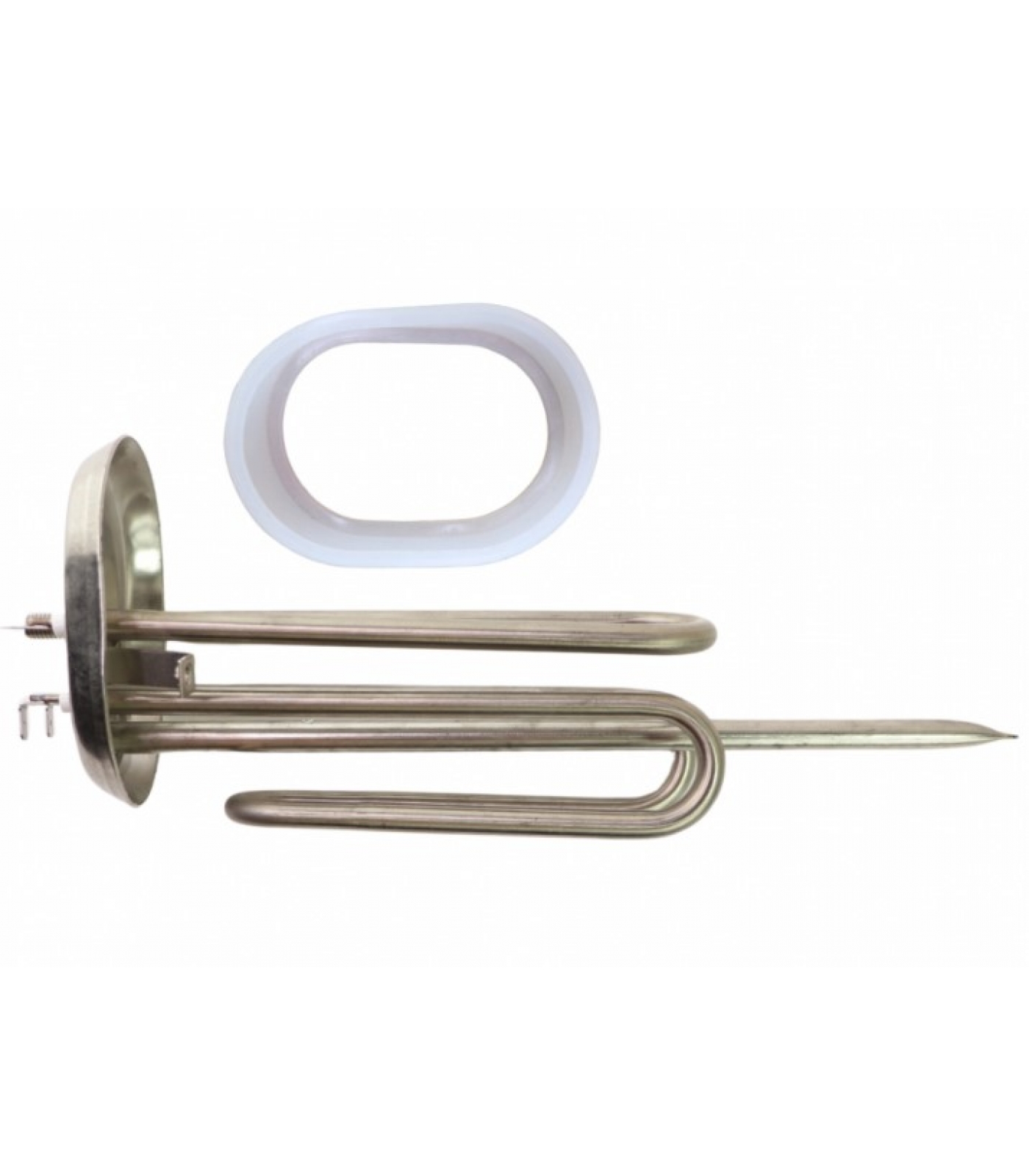 ТЭН работает при напряжении 220 В и оснащен клеммами под разъем для удобства подключения. Комплект также включает прокладку для надежной герметизации соединений, предотвращая утечки воды.