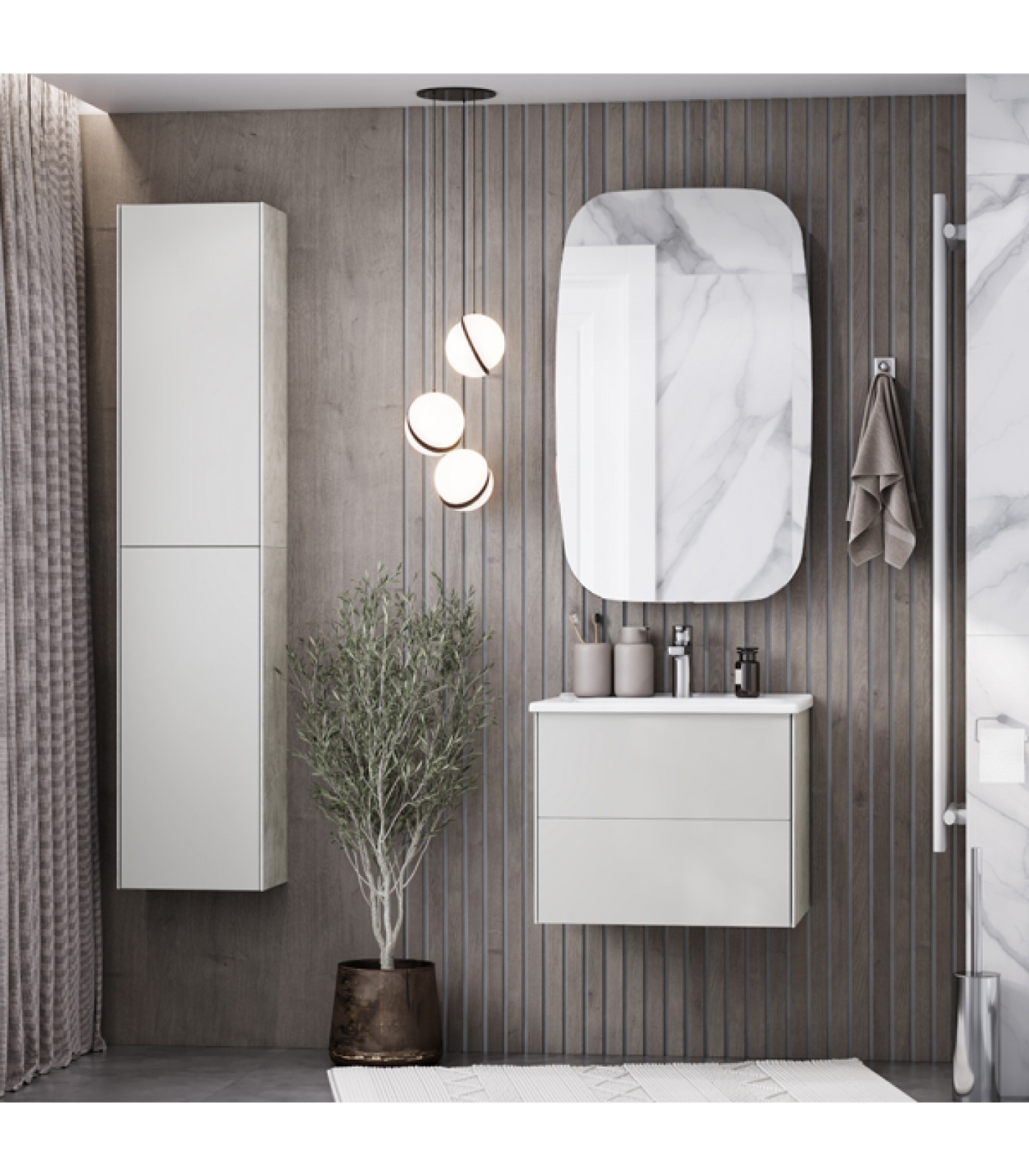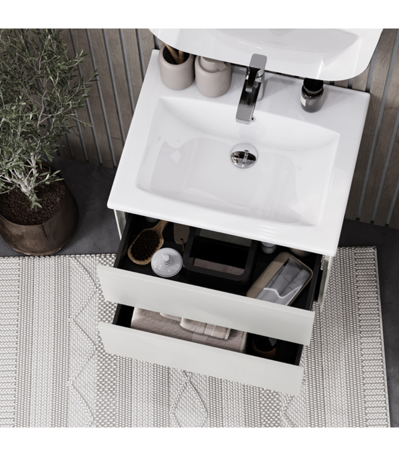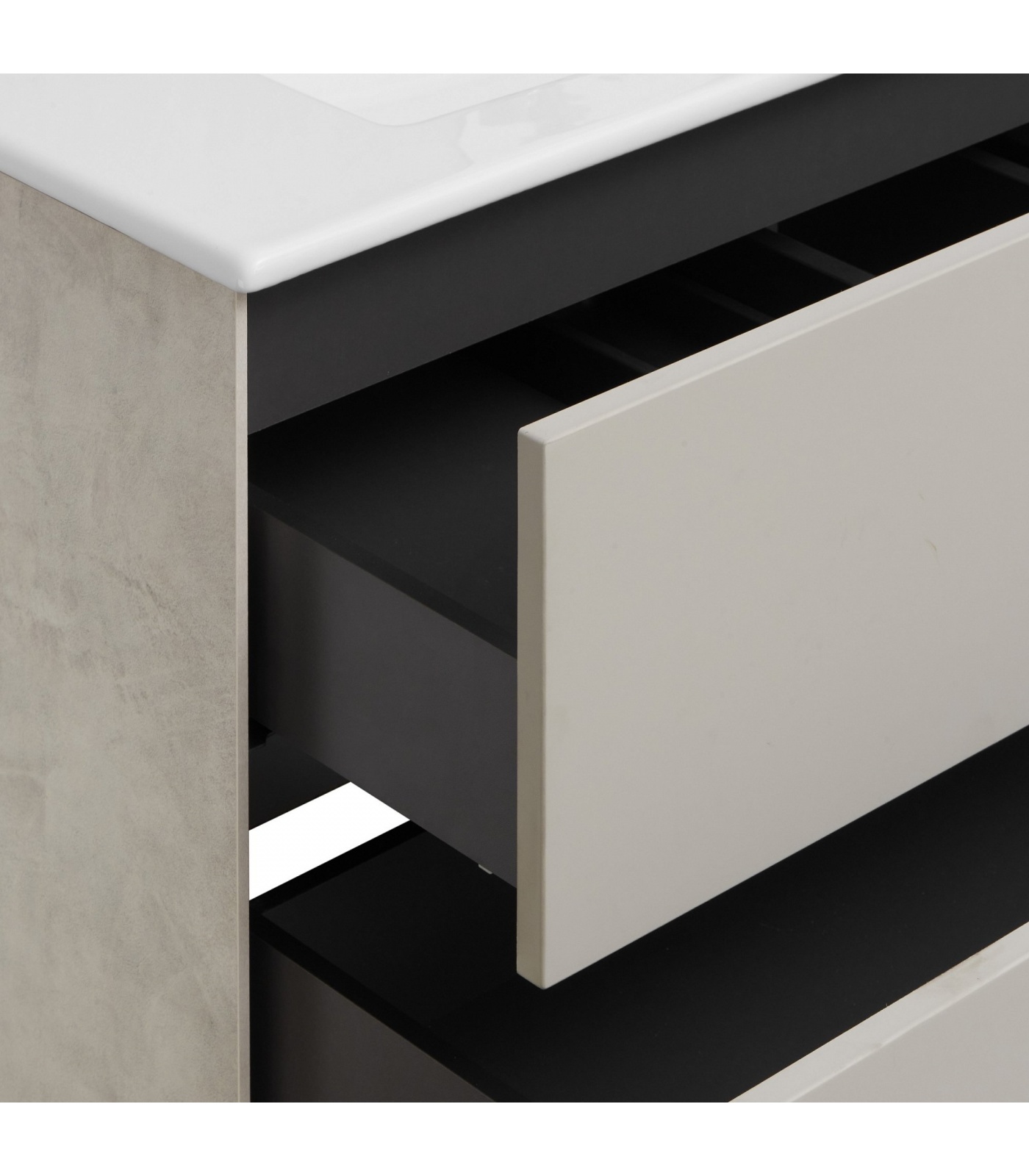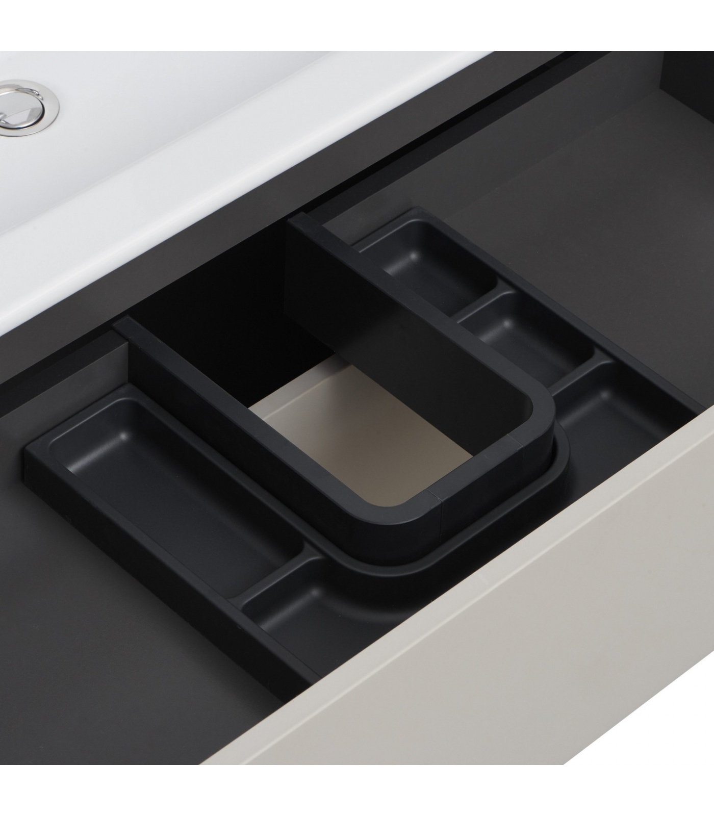 Тумба Сохо 60 состоит из двух вместительных ящиков, оснащенных системой push to open,обеспечивающей надежное, комфортное и бесшумное закрывание. Фасады изделия выполнены из МДФ в пленке в цвете галька серая, корпус из ламинированной влагостойкой ДСП слэйт. Верхний и нижний ящики оснащены системой организации пространства, которая позволяет содержать косметические средства в идеальном порядке. Дополняет тумбу стильная раковина Элина от бренда Santek с удобной чашей. Все внутренние детали тумбы выполнены в цвете антрацит.