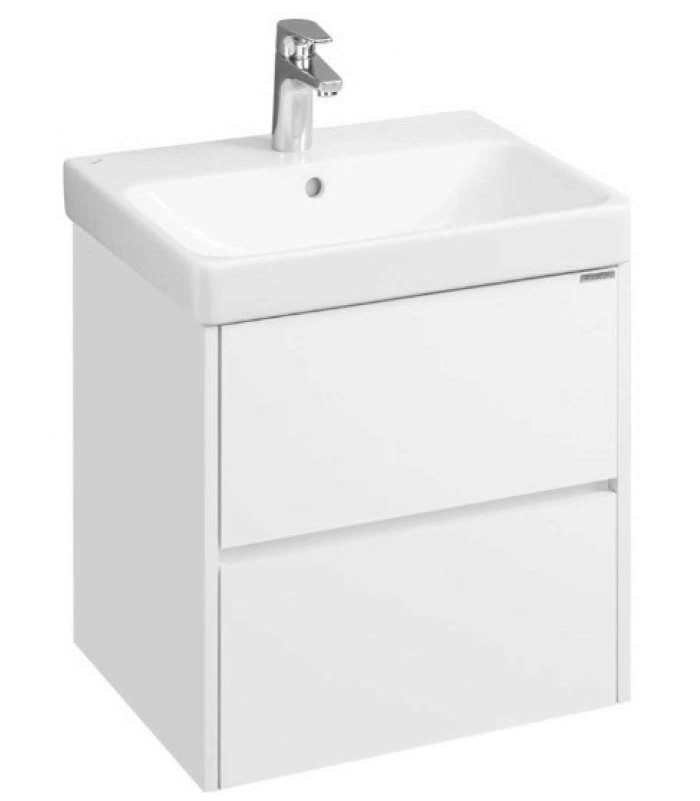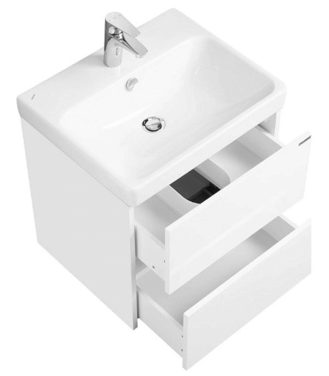 Тумба Сканди 55 выполнена в популярном минималистичном скандинавском стиле. Корпус тумбы выполнен из влагостойкой ЛДСП в белой матовой покраске, а фасады в белой глянцевой покраске. Конструктивно тумба состоит из 2 вместительных ящиков, установленных на направляющие с интегрированной системой push-to-open для комфортного использования. На тумбе нет выступающих деталей и фурнитуры, открытие ящиков реализовано нажатием на фасад.