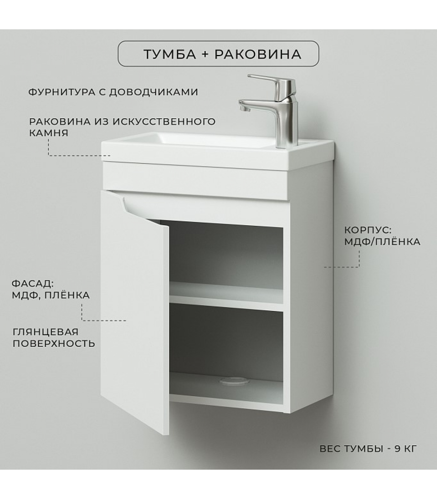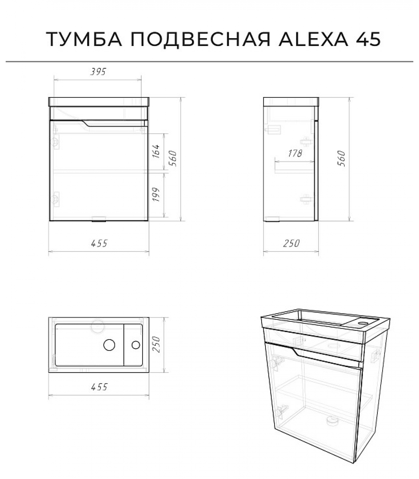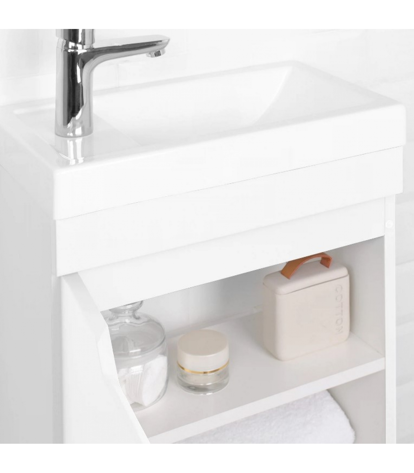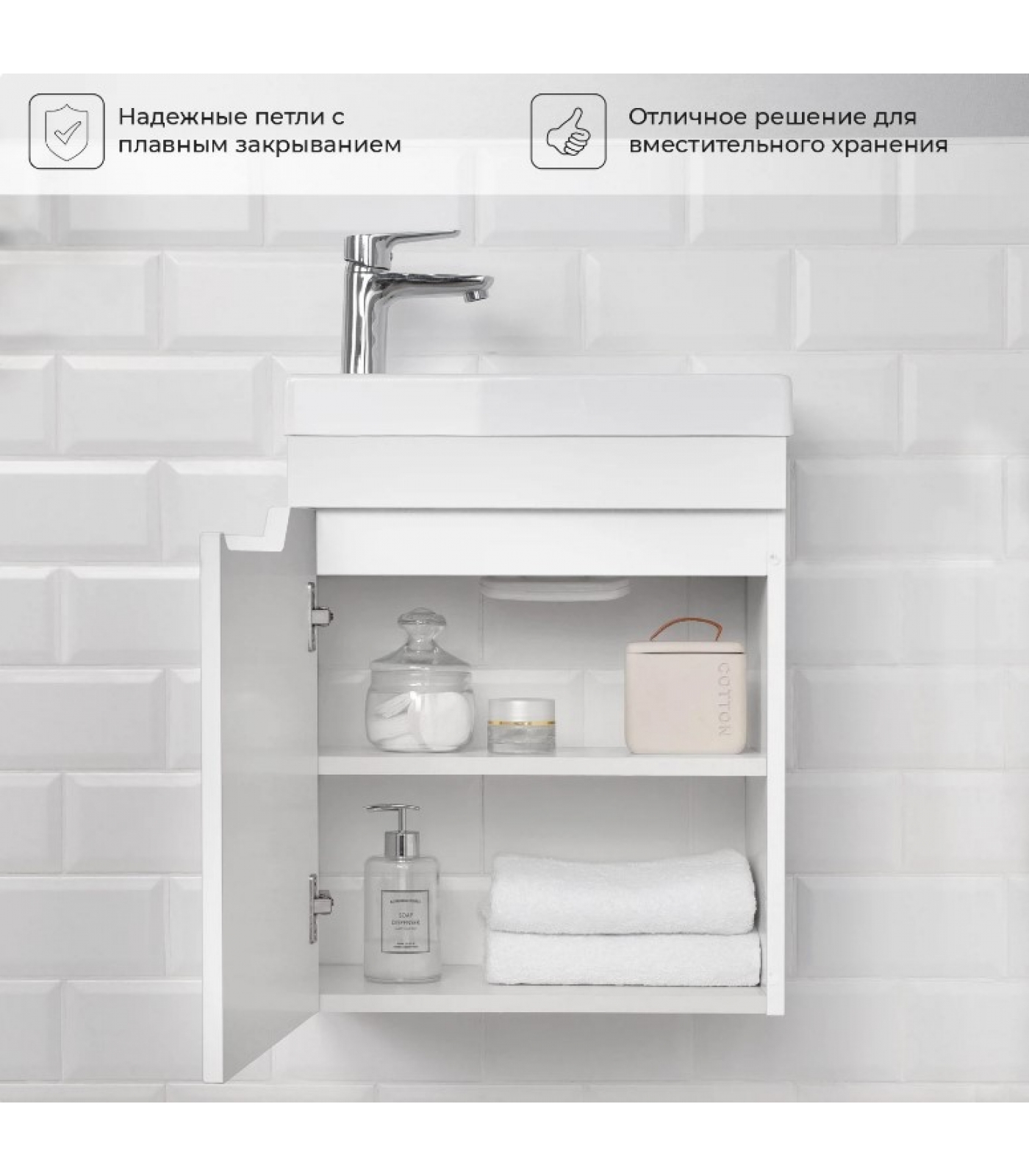 Тумба с раковиной подвесная Итана Alexa 45 с распашной дверцей левая узкая Белый глянец