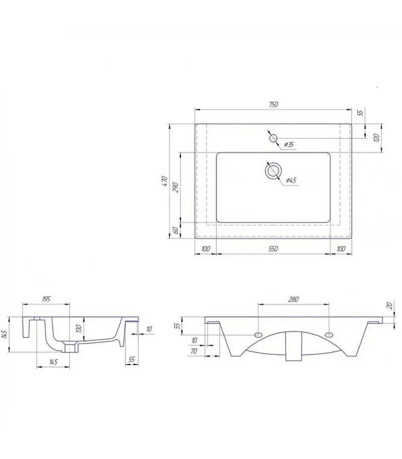 Прямоугольная мебельная раковина "Оскар" устанавливается на мебель, имеет отверстие для смесителя и систему перелива с декоративным кольцом.