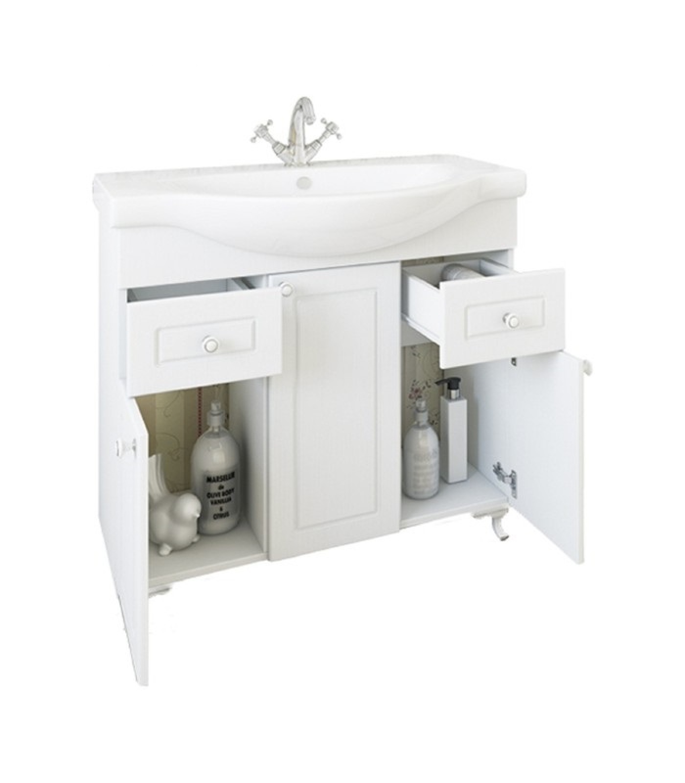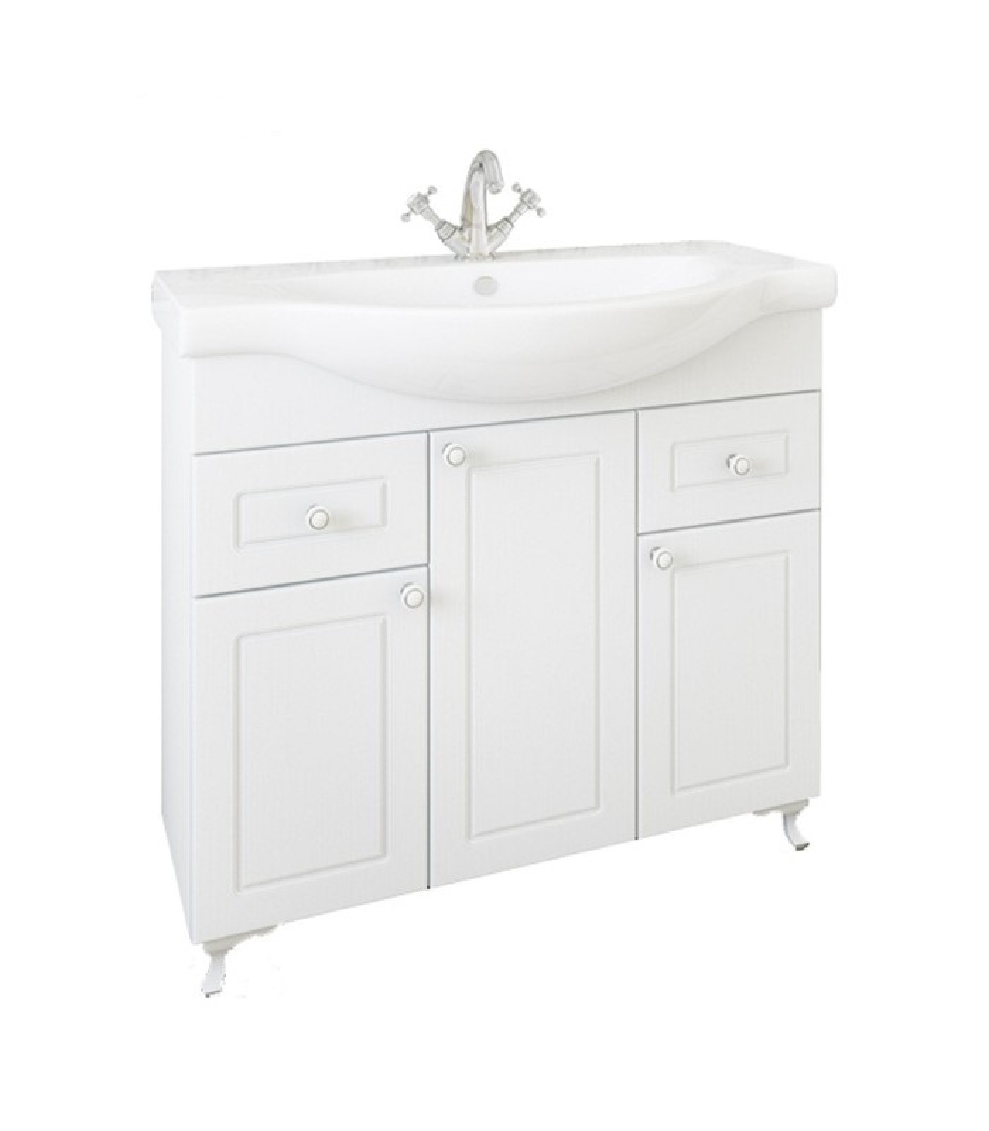 Тумба Sanflor Софи выполнена в классическом стиле. Благодаря плавным линиям и изысканному стилю мебель станет украшением любой ванной комнаты. Тумба оснащена 3 дверцами и 2 выдвижными ящиками. Раковина имеет слив-перелив и одно отверстие для смесителя, расположенное по центру. Каркас выполнен из влагостойкой ЛДСП, в составе которого полностью отсутствуют опасные вещества.