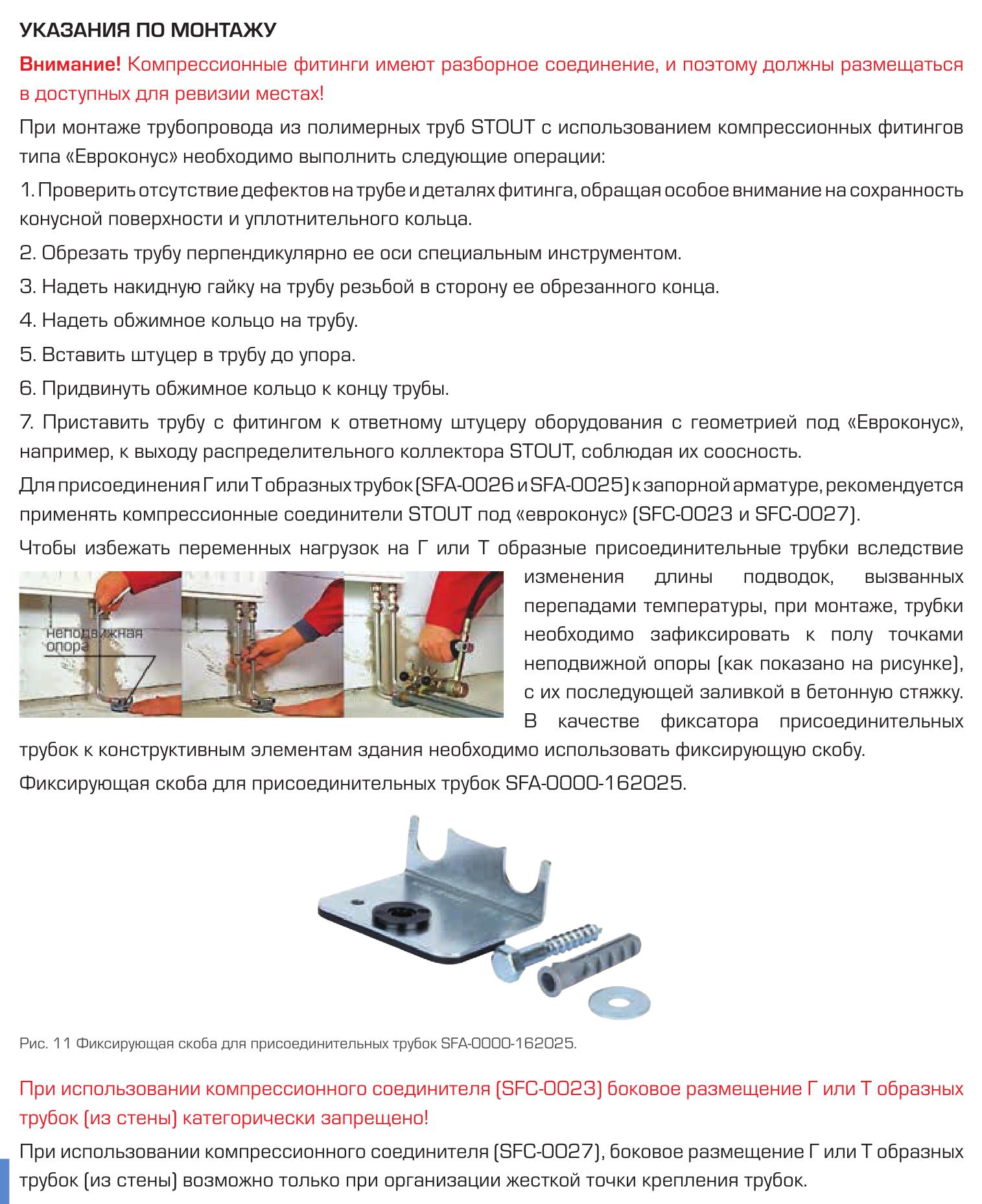 Перед монтажом бухты труб, хранившиеся или перевозимые при температуре ниже 0 °С, должны быть выдержаны в течение 24 часов при температуре не менее 10 °С. Монтаж трубопроводов из труб PE-Xa/EVOH следует предусматривать скрытым: в полу, за плинтусами и экранами, в штробах, шахтах и каналах. На строительных конструкциях трубы должны быть закреплены с помощью скользящих (подвижных) опор при расстоянии между ними, равном 20‒30 наружным диаметрам трубы. (В случае замоноличивания труба PE-Xa должна быть защищена гофротрубой ПНД или теплоизоляцией, кроме напольного отопления.