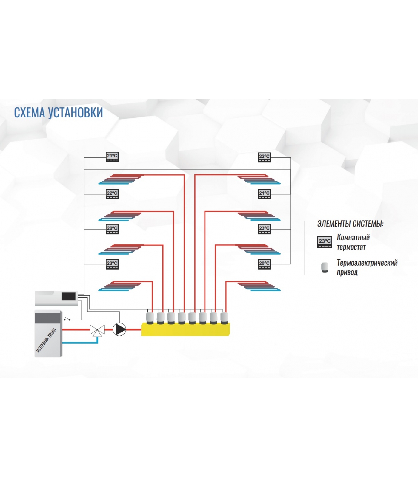 Контроллер может управлять 22 электротермическими приводами в 8 отдельных температурных зонах, управлять котлом, циркуляционным насосом в режиме включено/выключено.