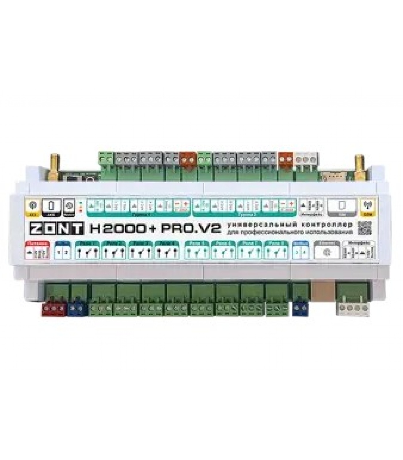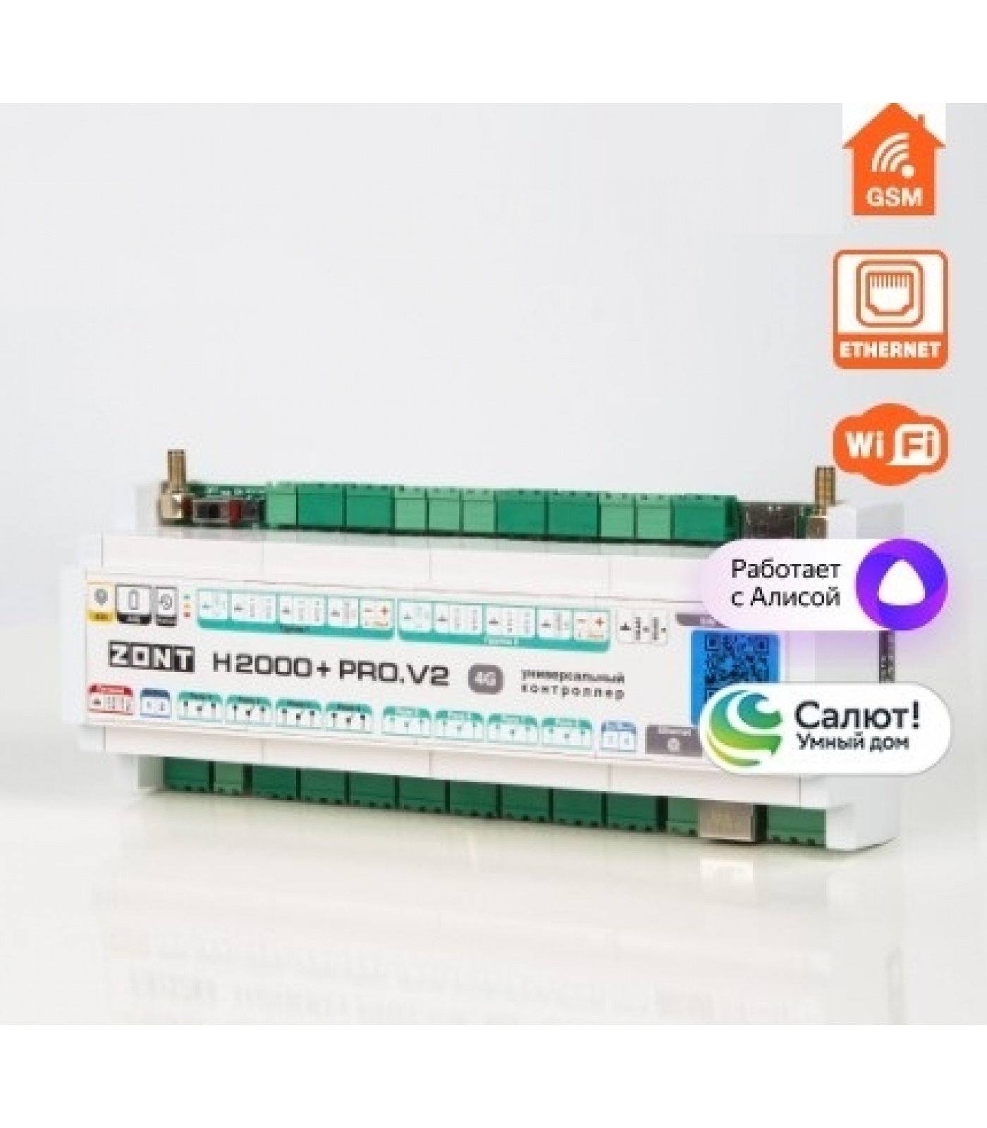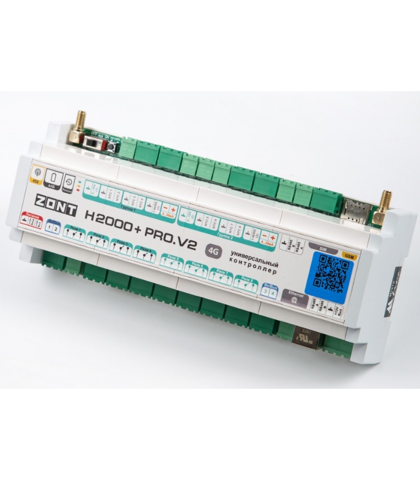 Универсальный контроллер ZONT H2000+ PRO.V2 — обновленная версия контроллера H2000+ PRO. Он обладает возможностями гибкого программирования для решения задач автоматизации и подходит для контроля и управления сложными системами отопления.