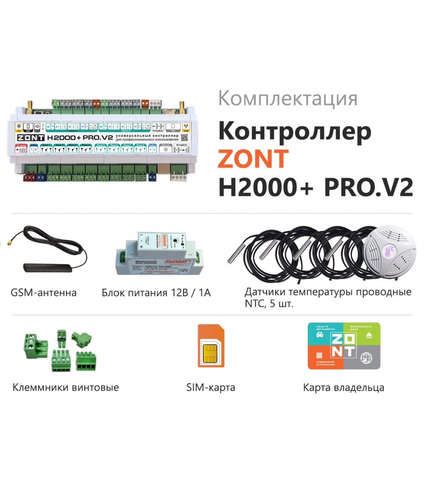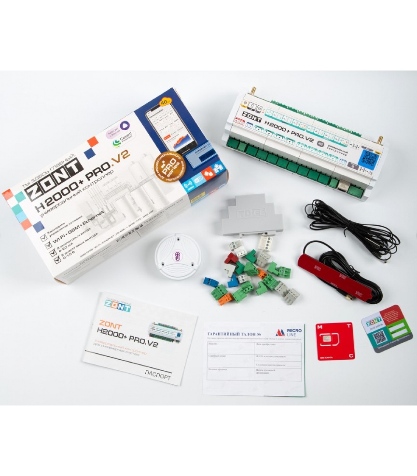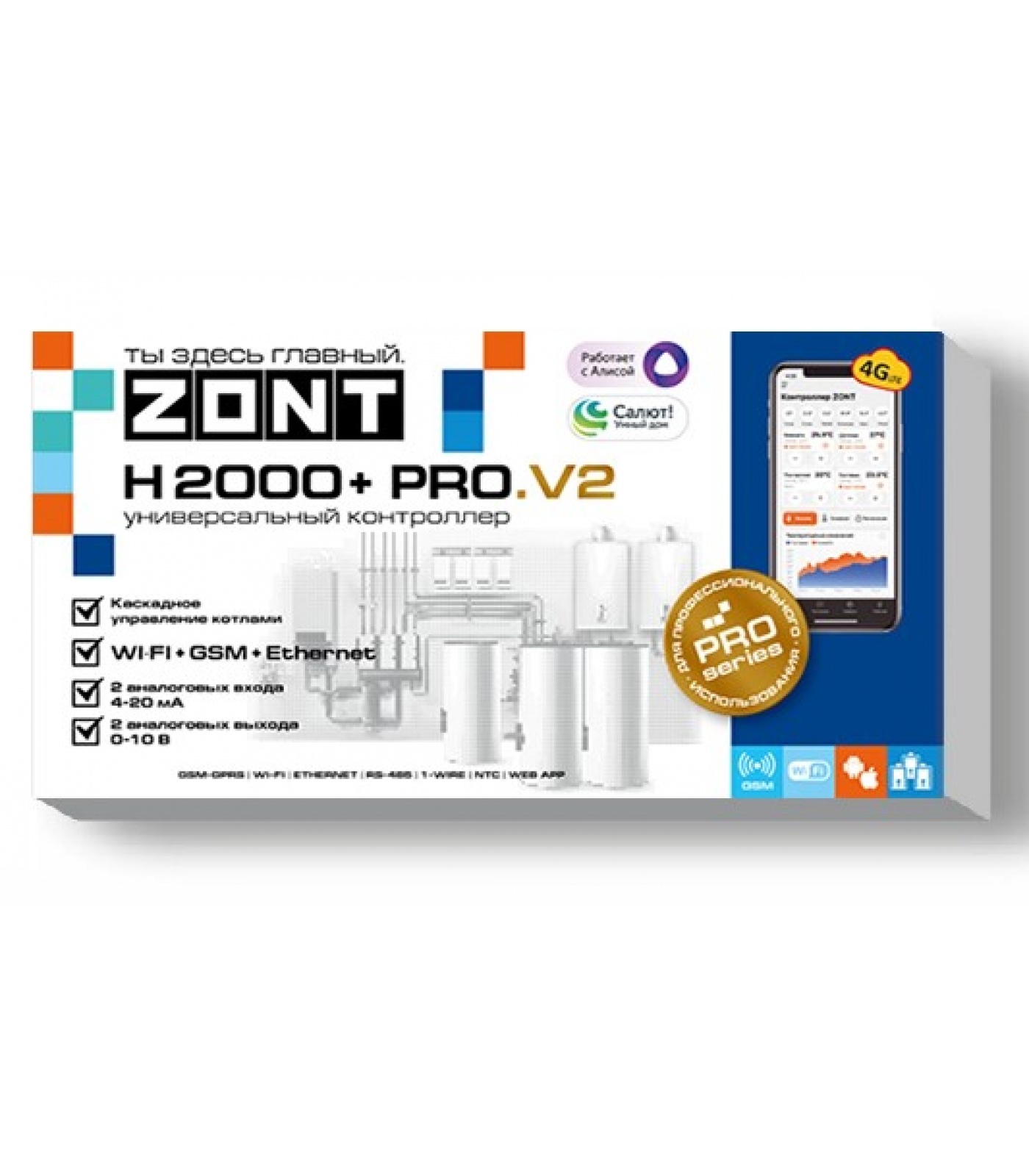 Универсальный контроллер ZONT H2000+ PRO.V2 — обновленная версия контроллера H2000+ PRO. Он обладает возможностями гибкого программирования для решения задач автоматизации и подходит для контроля и управления сложными системами отопления.