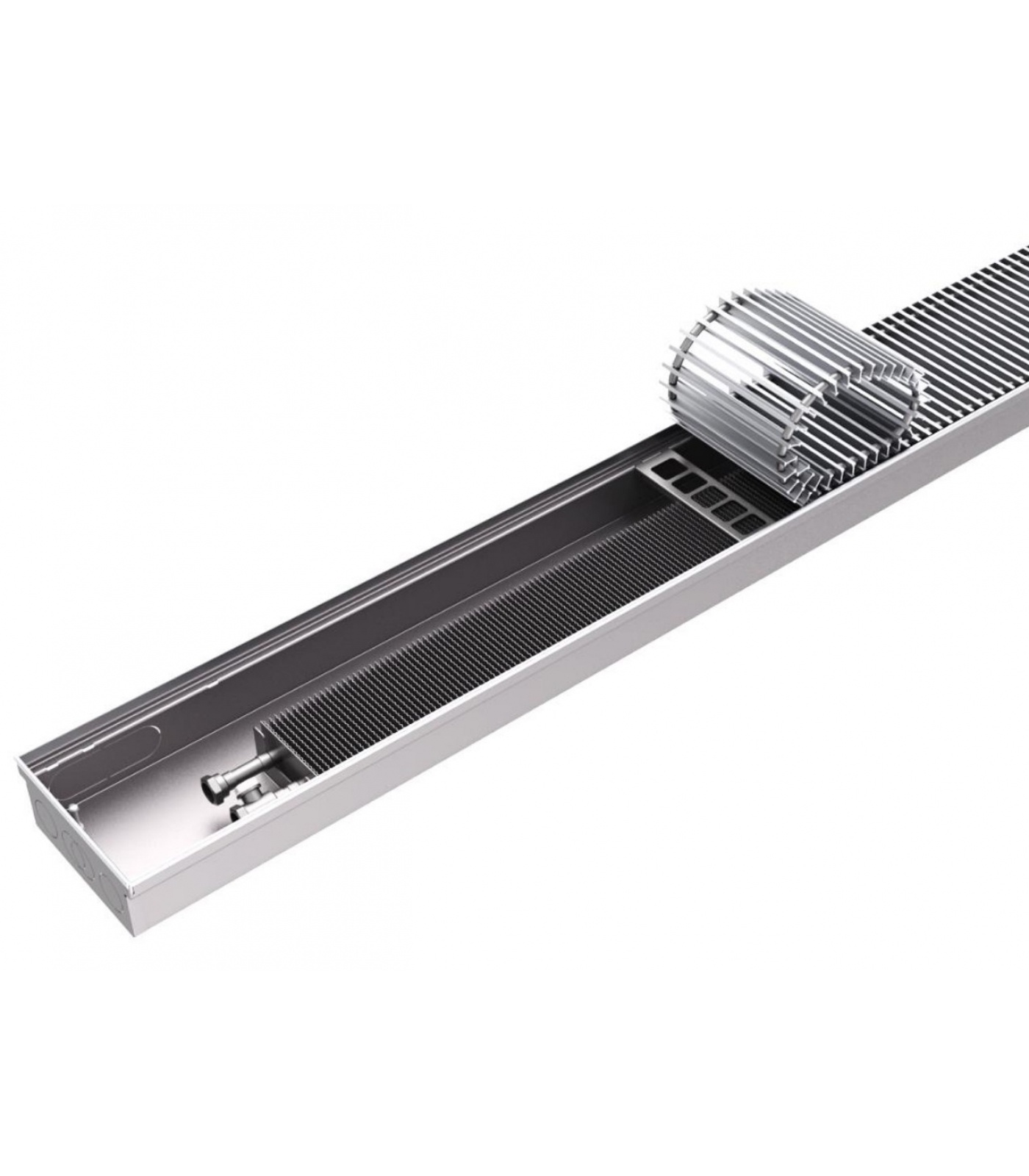 Внутрипольный конвектор работает по принципу свободной (естественной) конвекции. Воздух помещения опускается через переднюю часть решетки в продольный канал между стенкой корпуса и теплообменником и затем, нагреваясь, выходит вверх через другую ее половину.