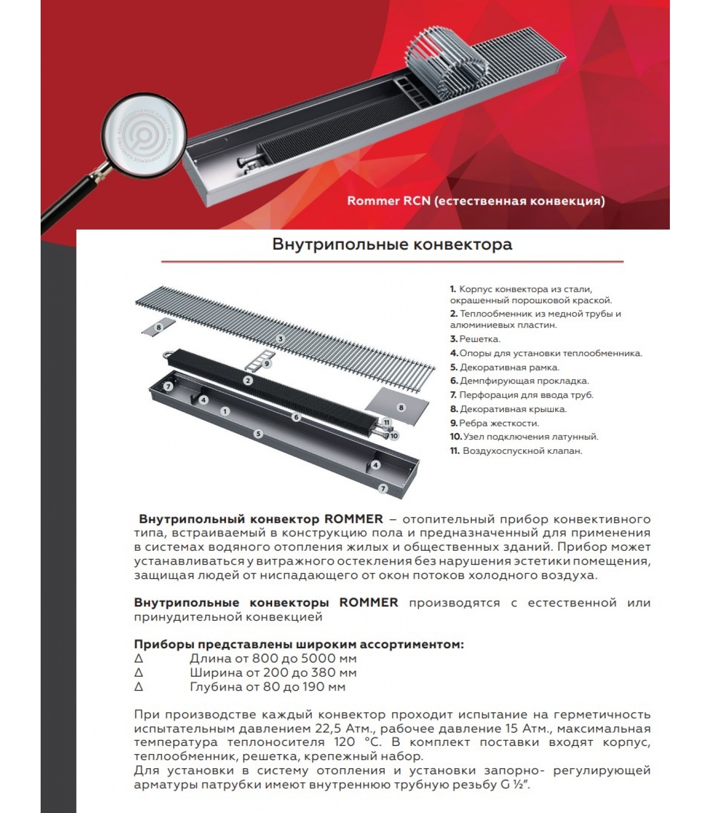Внутрипольный конвектор ROMMER тип RCN – отопительный прибор конвективного типа, встраиваемый в конструкцию пола и предназначенный для применения в системах водяного отопления жилых и общественных зданий. Прибор может устанавливаться у витражного остекления без нарушения эстетики помещения, защищая людей от ниспадающего от окон потоков холодного воздуха.