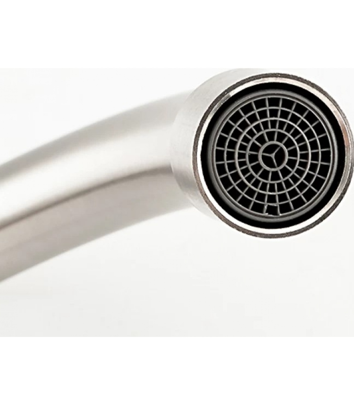 Аэратор в составе смесителя обеспечивает равномерный поток воды, помогает экономить воду, уменьшает количество брызг.
