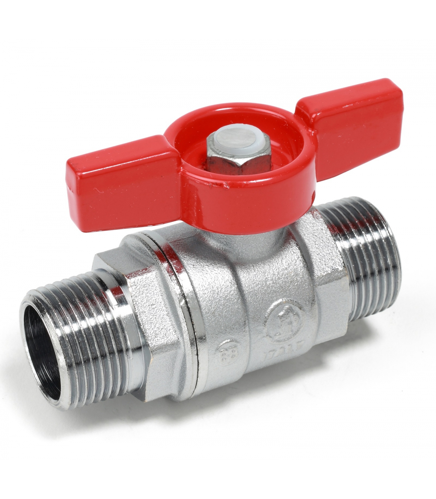 R253D Кран шаровой, резьба наружная/наружная, стандартный проход, хромированный, ручка - бабочка красная