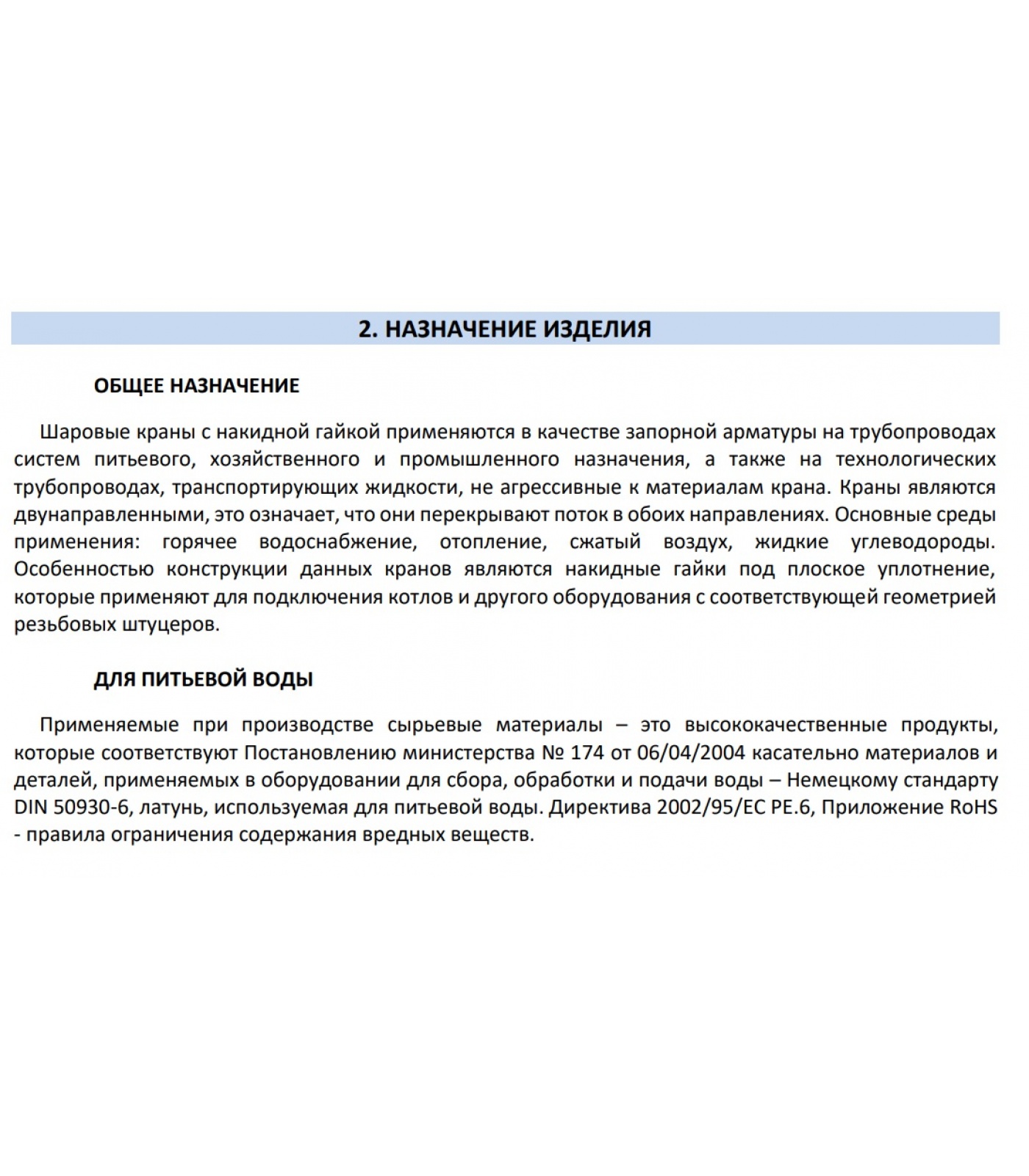 Шаровые краны с накидной гайкой применяются в качестве запорной арматуры на трубопроводах систем питьевого, хозяйственного и промышленного назначения, а также на технологических трубопроводах, транспортирующих жидкости, не агрессивные к материалам крана. Краны являются двунаправленными, это означает, что они перекрывают поток в обоих направлениях. Основные среды применения: горячее водоснабжение, отопление, сжатый воздух, жидкие углеводороды.