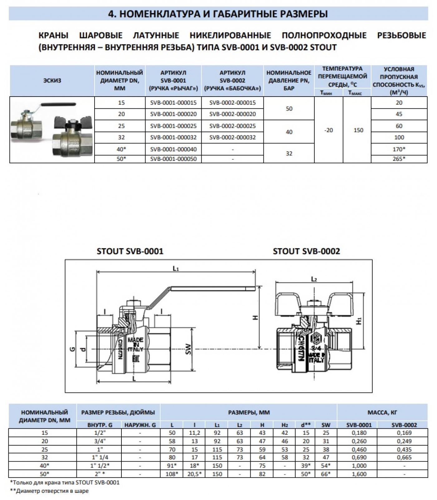 Кран шаровой STOUT полнопроходной, ВР/ВР, ручка рычаг 1