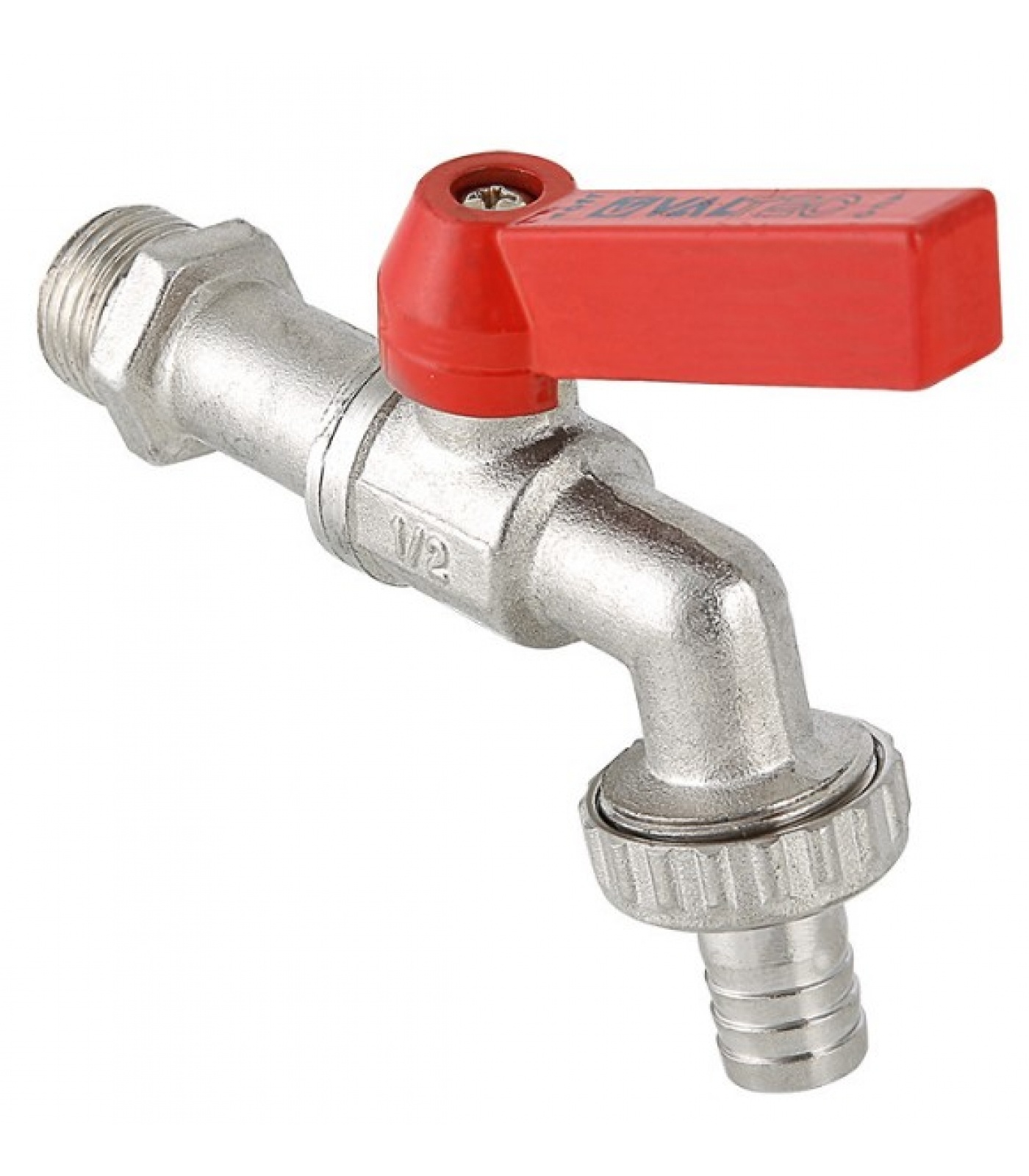 (VT.051.N) Латунный никелированный кран, применяемый в качестве запорной арматуры на трубопроводах систем водоснабжения (в том числе питьевого). Наличие съемного штуцера с накидной гайкой дает возможность производить его замену в зависимости от диаметра и материала применяемого шланга. Рассекатель обеспечивает формирование компактной струи на изливе. Кран оснащен алюминиевой рукояткой флажкового типа.