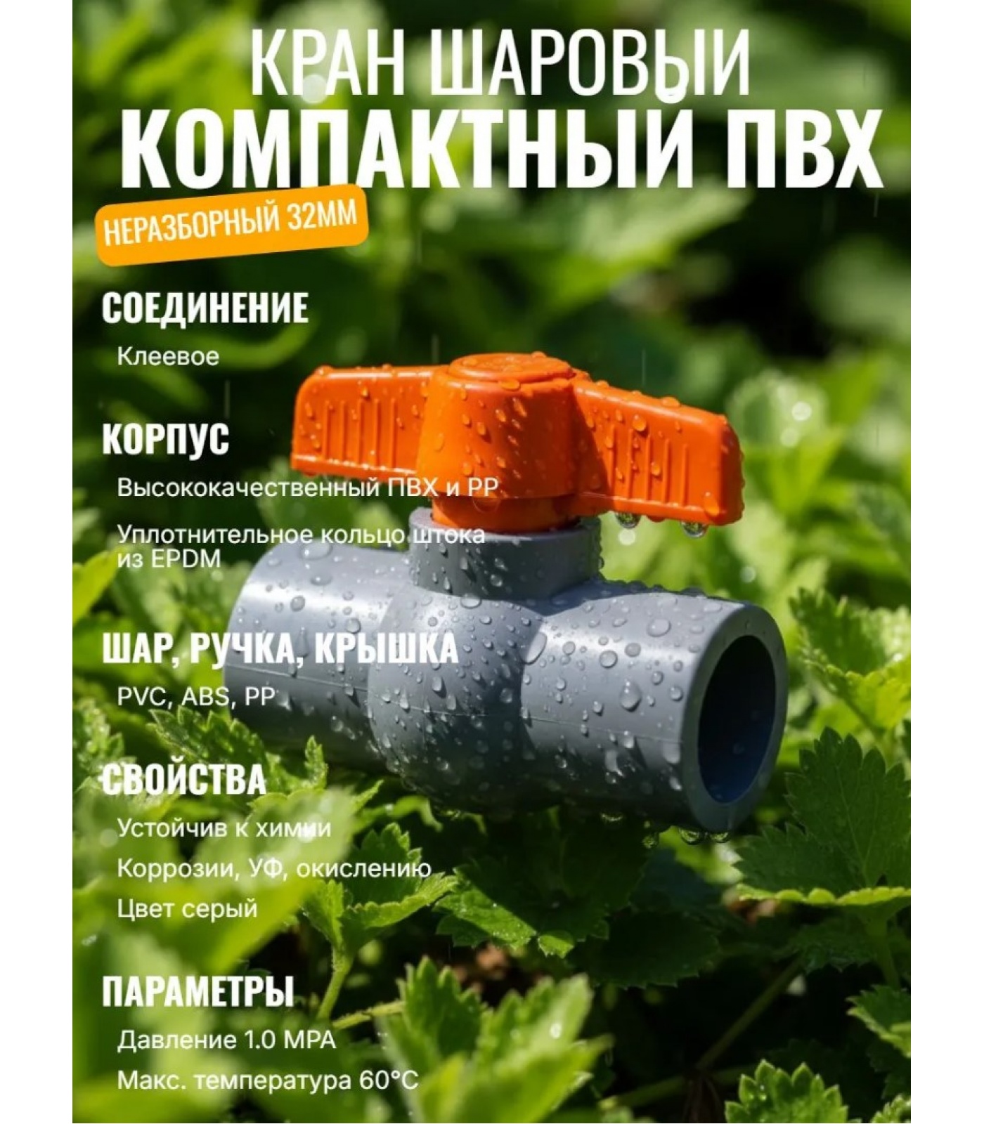 Корпус выполнен из высококачественного ПВХ и PP, уплотнительное кольцо штока из EPDM. Шар, ручка и крышка из PVC, ABS, PP.