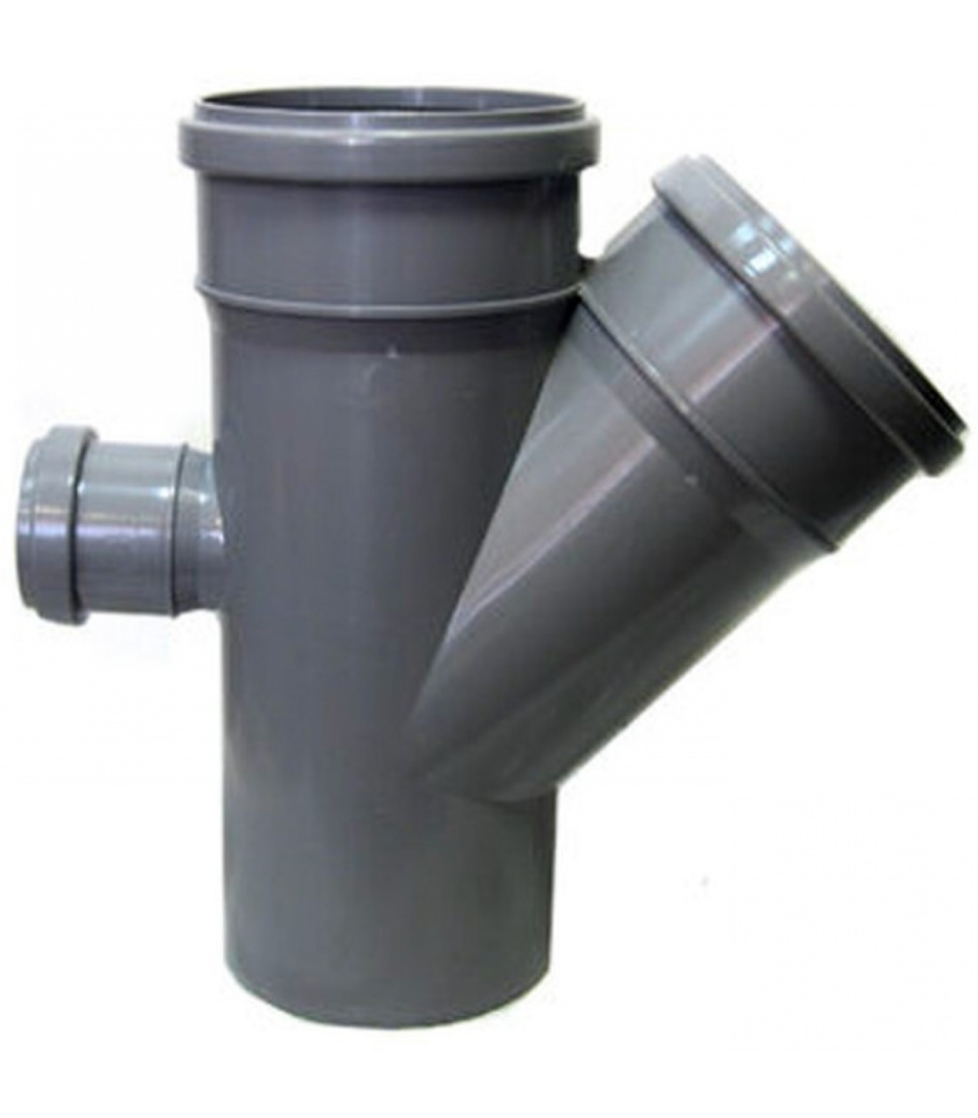 Крестовина канализационная одноплоскостная с патрубками 45° и 87°. Магистраль диаметром 110 мм, патрубок диаметром 110 мм по углом 45° и патрубок диаметром 50 мм по углом 87°.