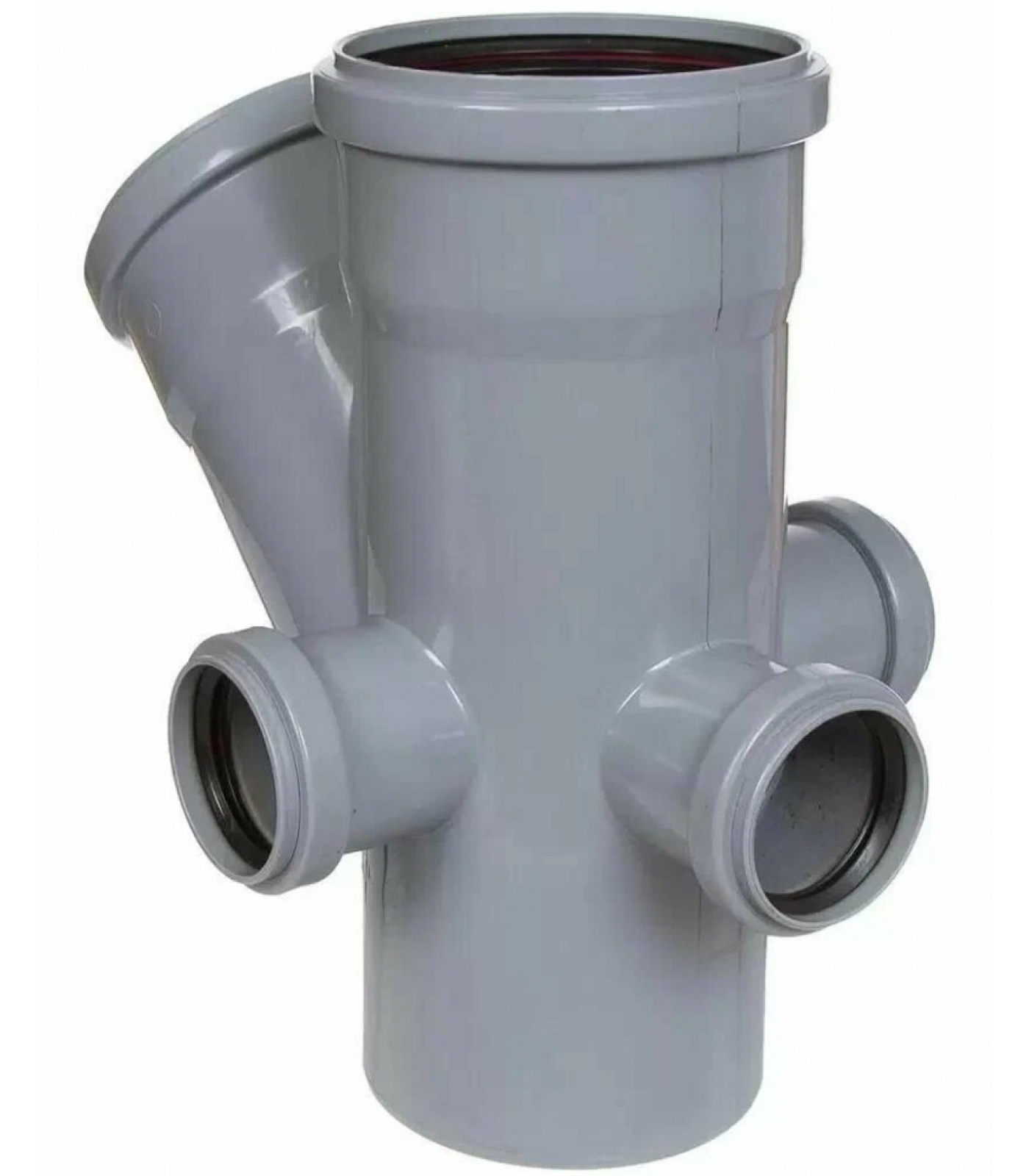 Крестовина канализационная двухплоскостная с патрубком 45° и патрубками 87° справа, слева и в тылу . Магистраль диаметром 110 мм, патрубок диаметром 110 мм по углом 45° и три патрубка диаметром 50 мм по углом 87° справа, слева и в тылу.