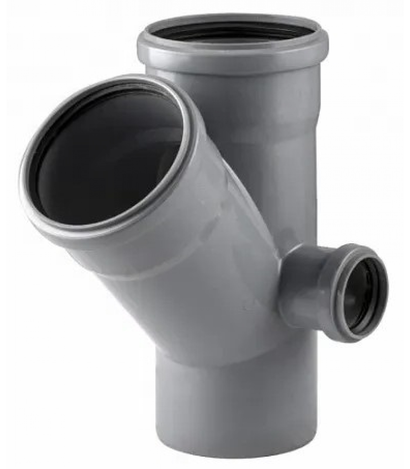Крестовина канализационная двухплоскостная с патрубками 45° и справа 87°. Магистраль диаметром 110 мм, патрубок диаметром 110 мм по углом 45° и патрубок диаметром 50 мм по углом 87° справа.