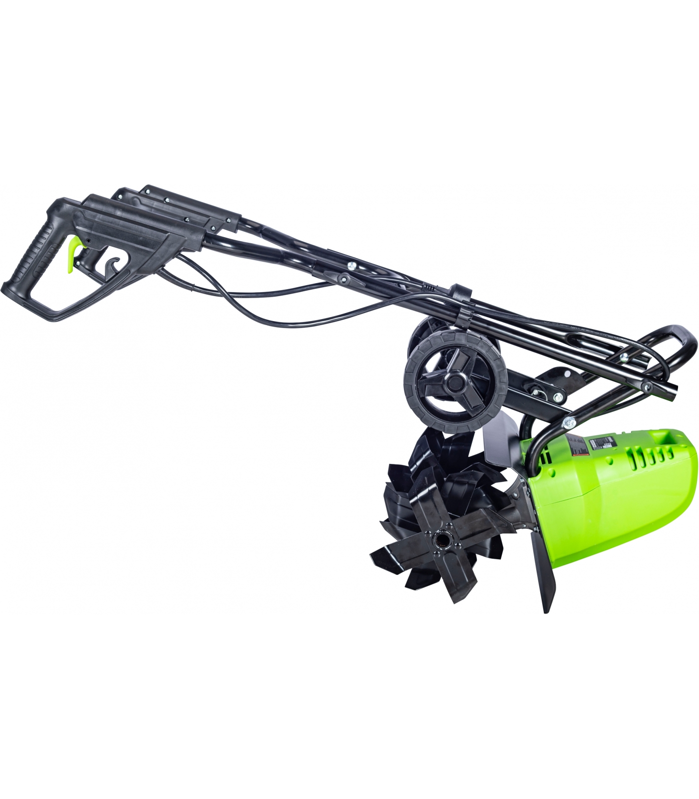 Культиватор оснащен четырьмя специальными фрезами - ножами с максимальной глубиной обработки в 20 см, ширина обработки составляет 40 см. Для экономии места при хранении ручка культиватора складывается, а для удобства использования предусмотрены опорные колеса. Для защиты от случайного включения культиватор оснащен кнопкой-предохранителем.