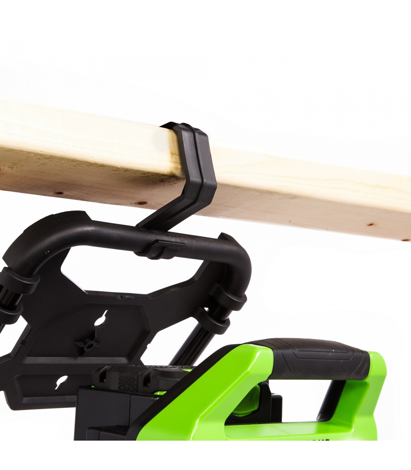 Прожектор Greenworks G24WL легко закрепить на любой поверхности, например, подвесить на S-образном крюке (в комплекте), зафиксировать на стене с помощью проушин в площадке рамы или выставить на штативе (в комплект не входит).