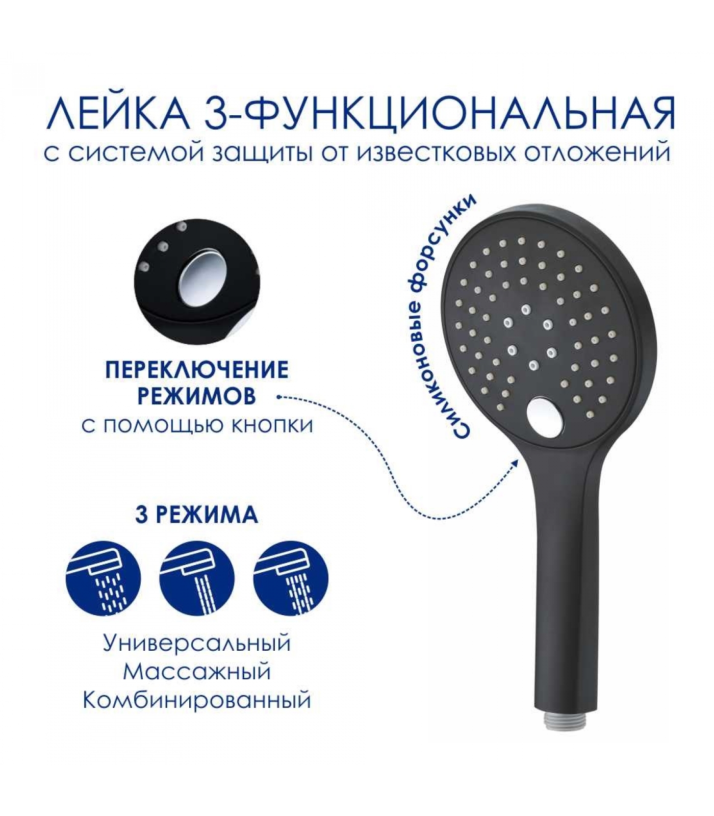 Лейка душевая WasserKRAFT A078 - стильный аксессуар для ванной комнаты, имеет 3 режима переключения подачи воды, переключение режимов воды в лейке осуществляется с помощью нажатия кнопки, которая находится на корпусе изделия. Покрытие лейки "Soft-touch" придаёт осязаемую мягкость изделию, благодаря чему к нему хочется прикасаться снова и снова. Форсунки лейки выполнены из силикона, что защищает ее от известковых отложений.