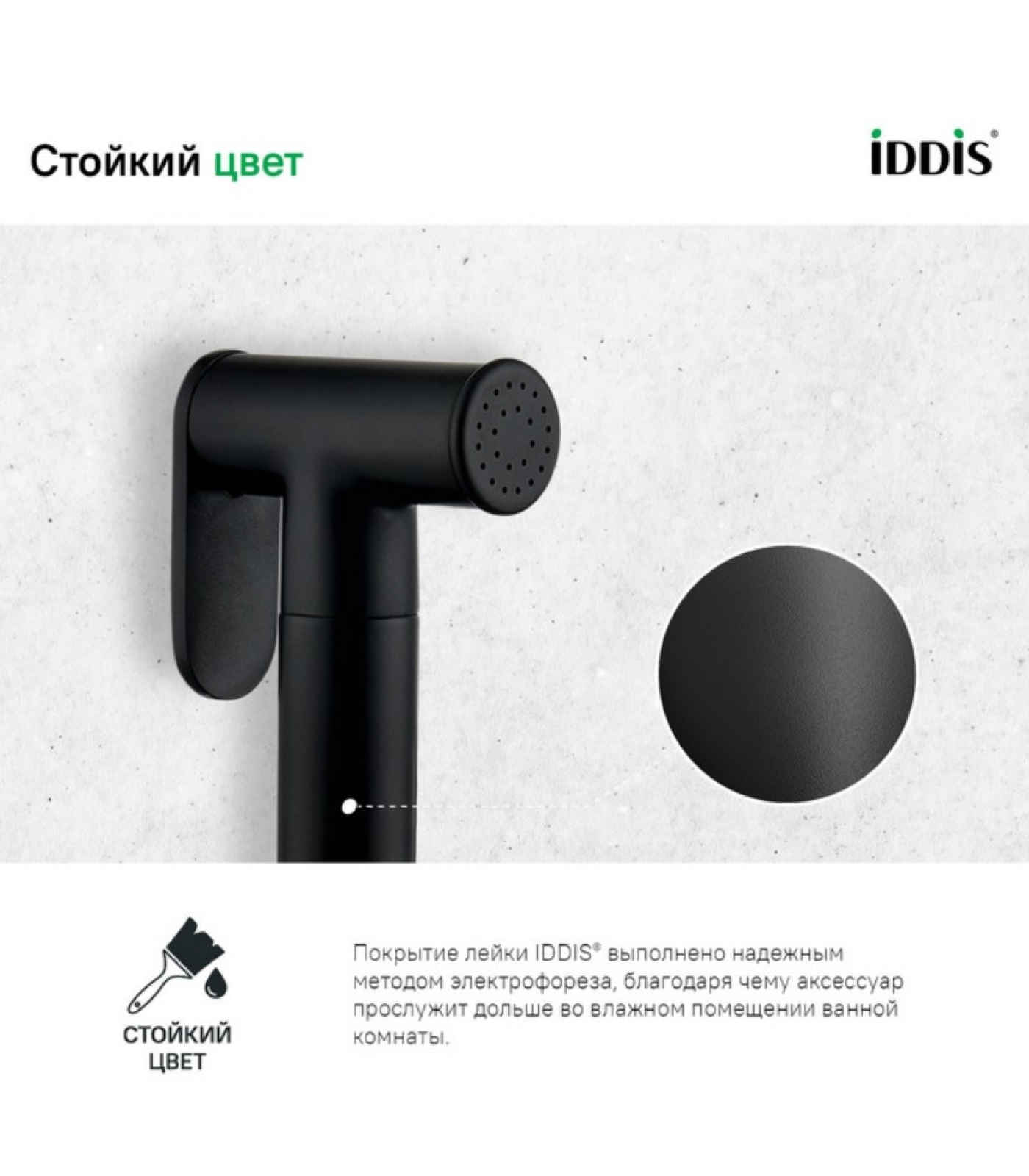Черное покрытие лейки IDDIS® выполнено надежным методом электрофореза, благодаря чему аксессуар прослужит дольше во влажном помещении ванной комнаты.